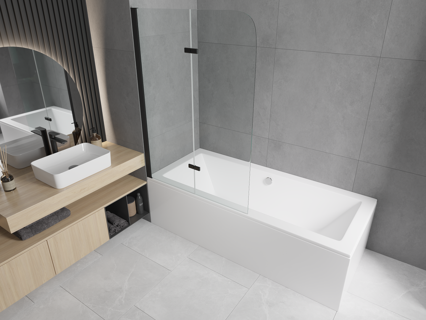 Paraván vyrobený z dvoch krídel s možnosťou zloženia. Takéto riešenie umožňuje ušetriť viac miesta v kúpeľni a umožňuje voľné využitie zvyšného priestoru, keď nepoužívame kúpeľnú zónu.
