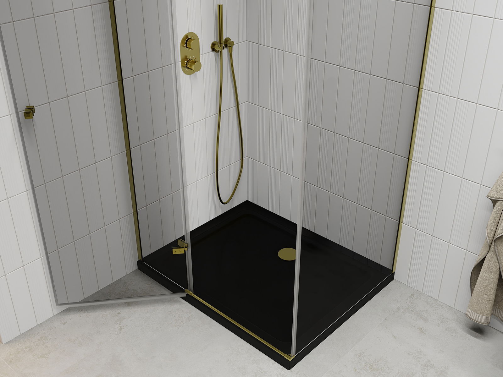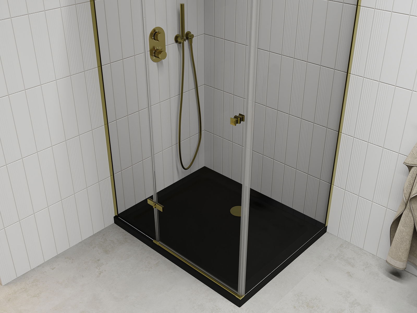 Praktická a pohodlná rukoväť je vyrobená z odolného a pevného kovu. Moderný tvar v kombinácii s povrchovou úpravou prispôsobenou farbe profilov dodáva celku moderný a štýlový vzhľad, zdôrazňujúc estetiku každej kúpeľne.