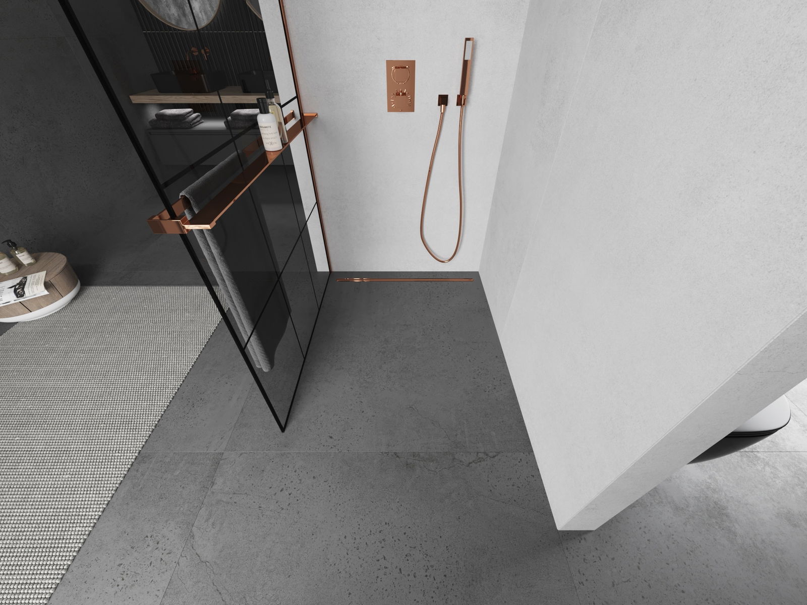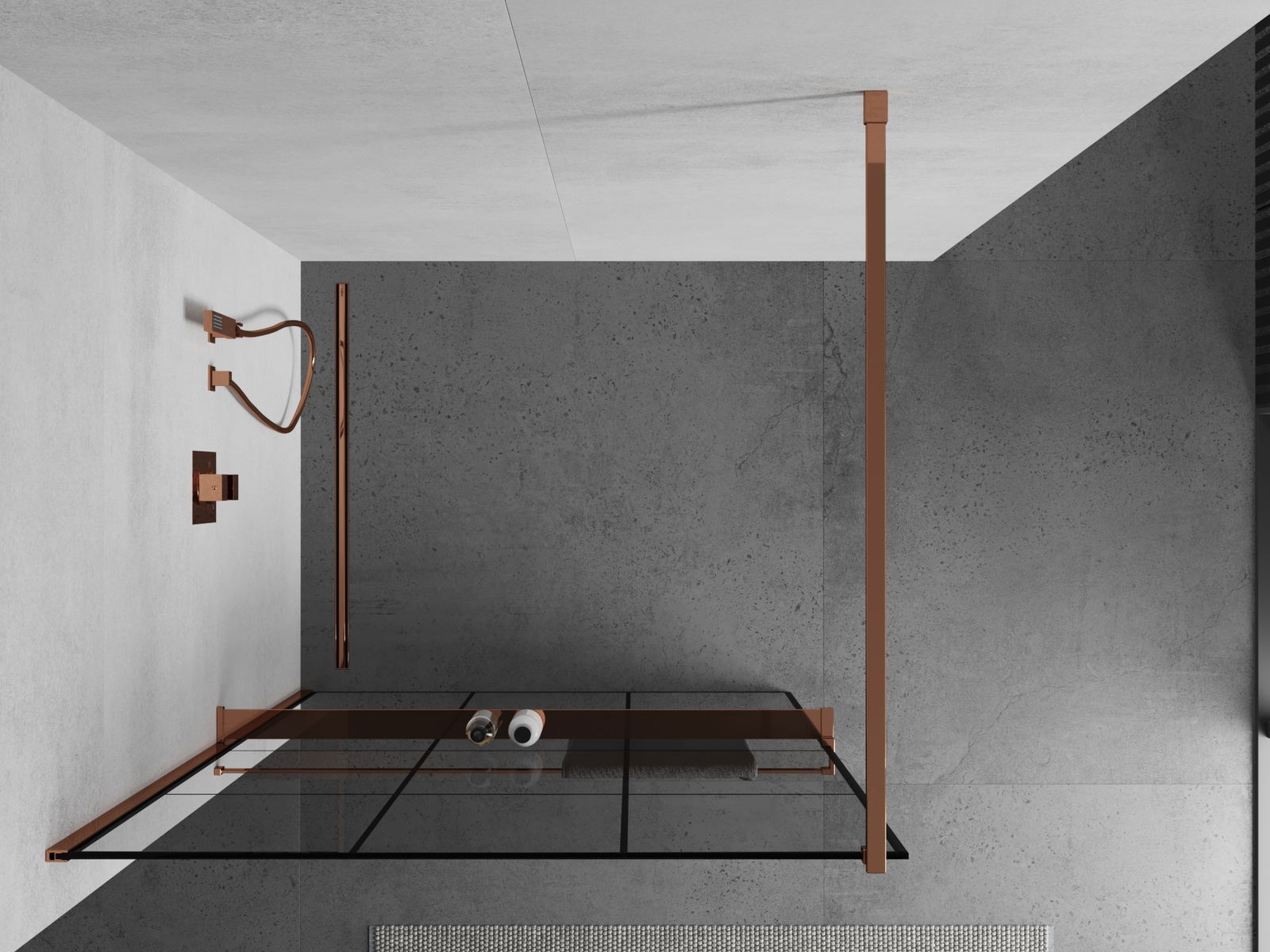 Mexen Kioto+ sprchová stena s poličkou Walk-in 100 x 200 cm, čierna mriežka, ružové zlato - 800-100-121-60-77