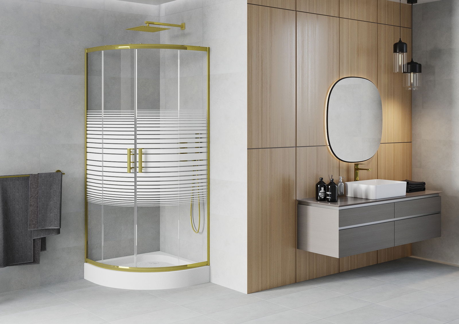 Mexen Rio polkruhová sprchová kabína 70 x 70 cm, biele pruhy, zlatá + sprchová vanička, biela - 863-070-070-50-20-4710