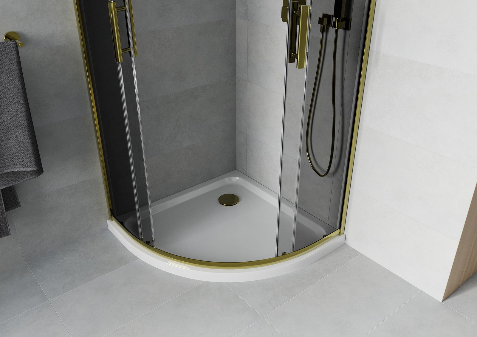 Mexen Rio polkruhová sprchová kabína 90 x 90 cm, grafitová, zlatá + sprchová vanička Flat, biela - 863-090-090-50-40-4110G