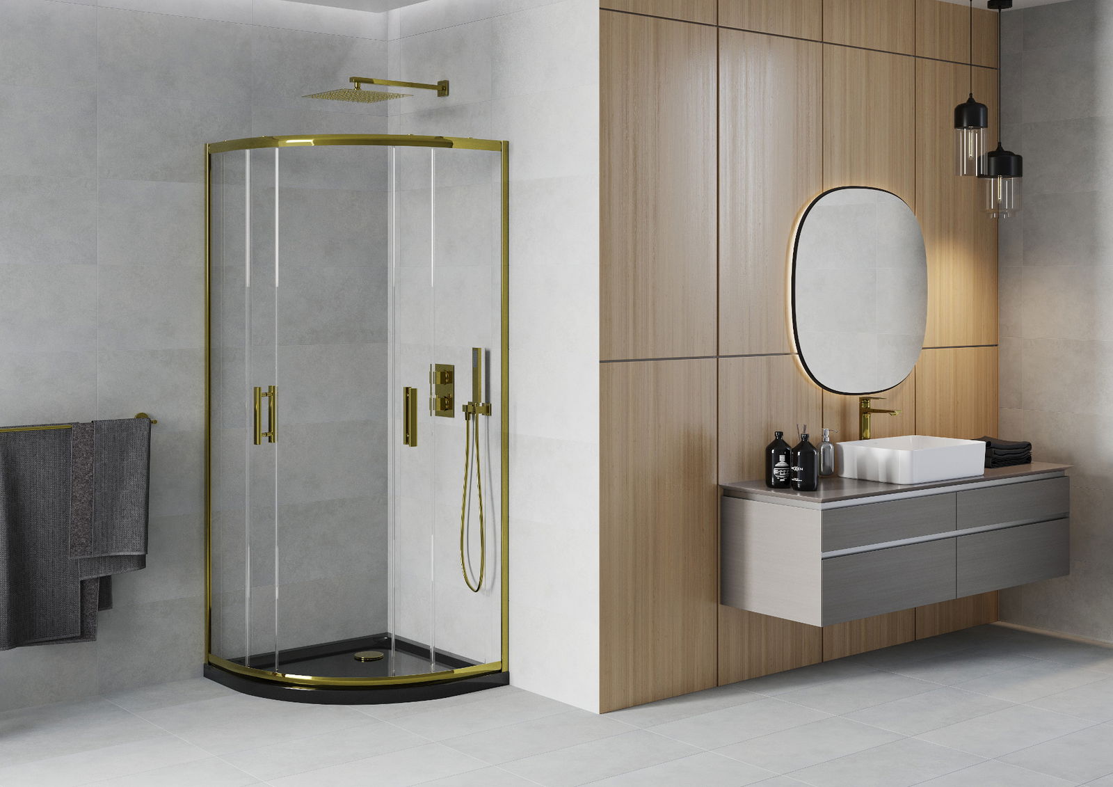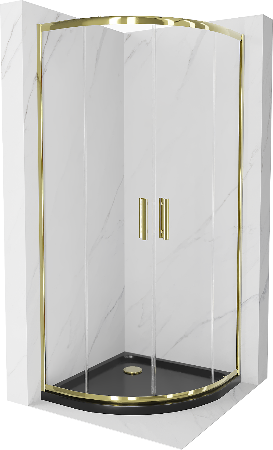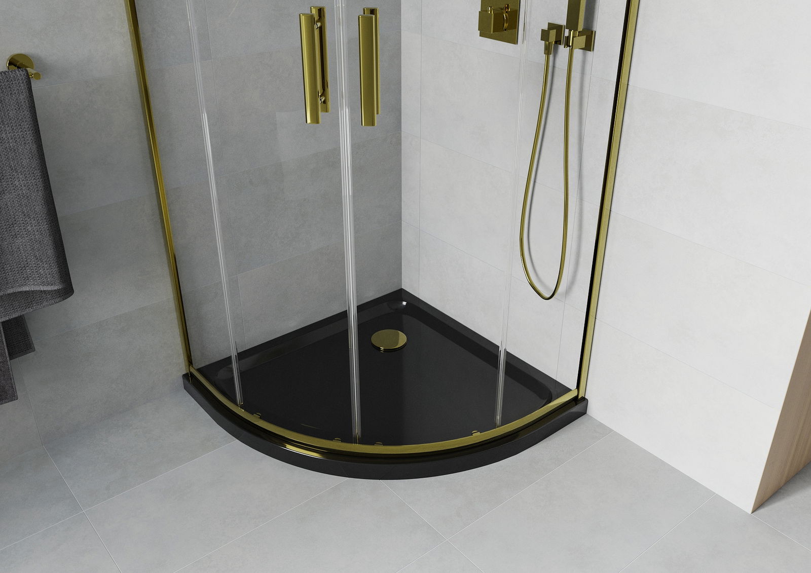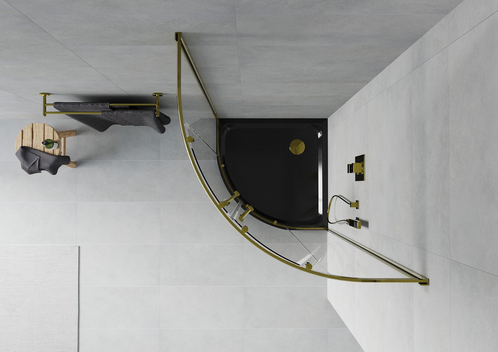 Mexen Rio polkruhová sprchová kabína 80 x 80 cm, transparentná, zlatá + sprchová vanička Flat, čierna - 863-080-080-50-00-4170G