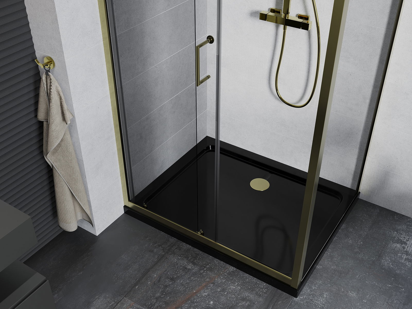 Praktická a pohodlná rukoväť je vyrobená z odolného a pevného kovu. Moderný tvar v kombinácii s povrchovou úpravou prispôsobenou farbe profilov dodáva celku moderný a štýlový vzhľad, zdôrazňujúc estetiku každej kúpeľne.