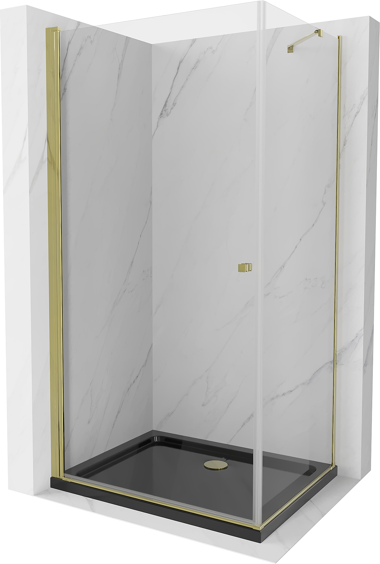 Mexen Pretoria sprchovací kút so závesnými dverami 90 x 70 cm, transparentný, zlatý + vanička Flat, čierna - 852-090-070-50-00-?