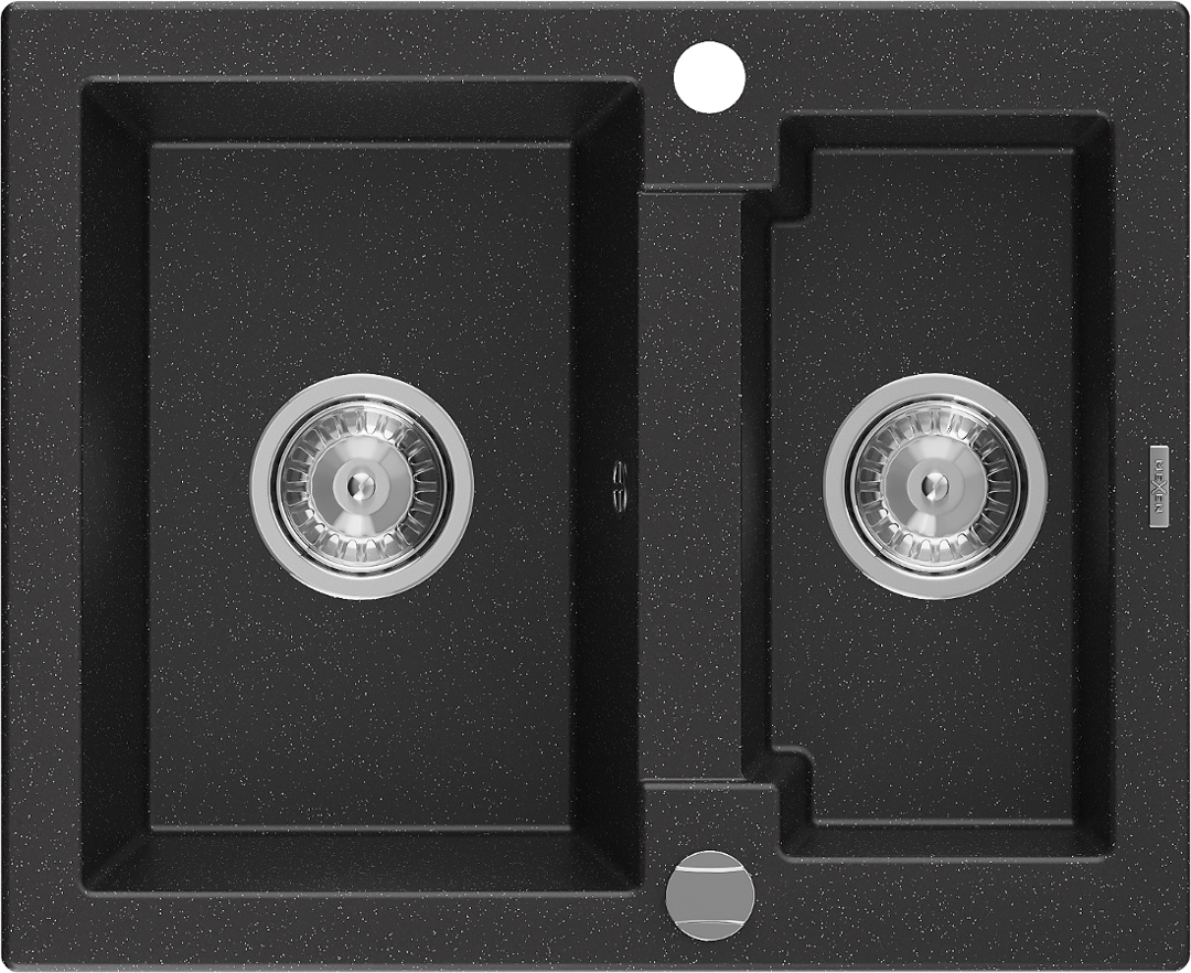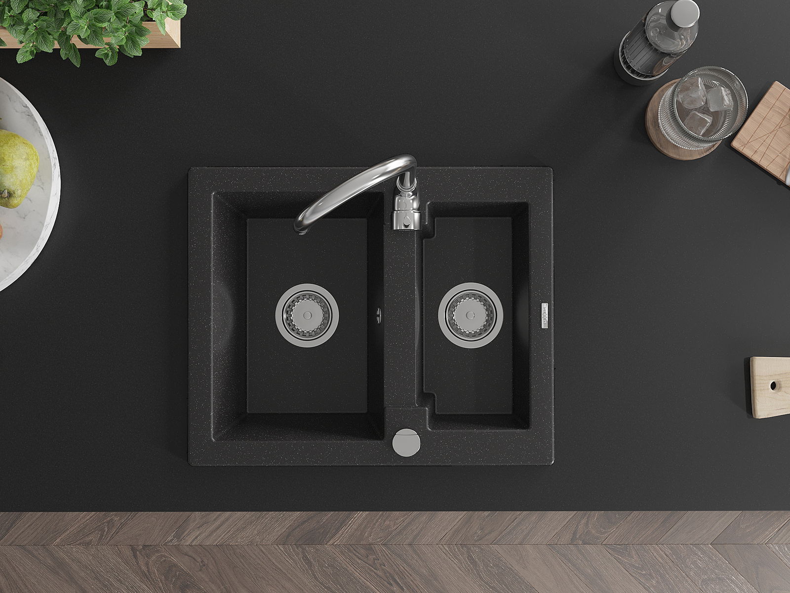 Mexen Carlos žulový drez 1,5-komorový 582 x 475 mm, čierny/strieborný metalik, sifón chróm - 6518581500-73