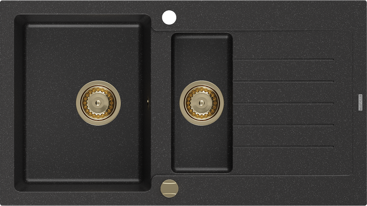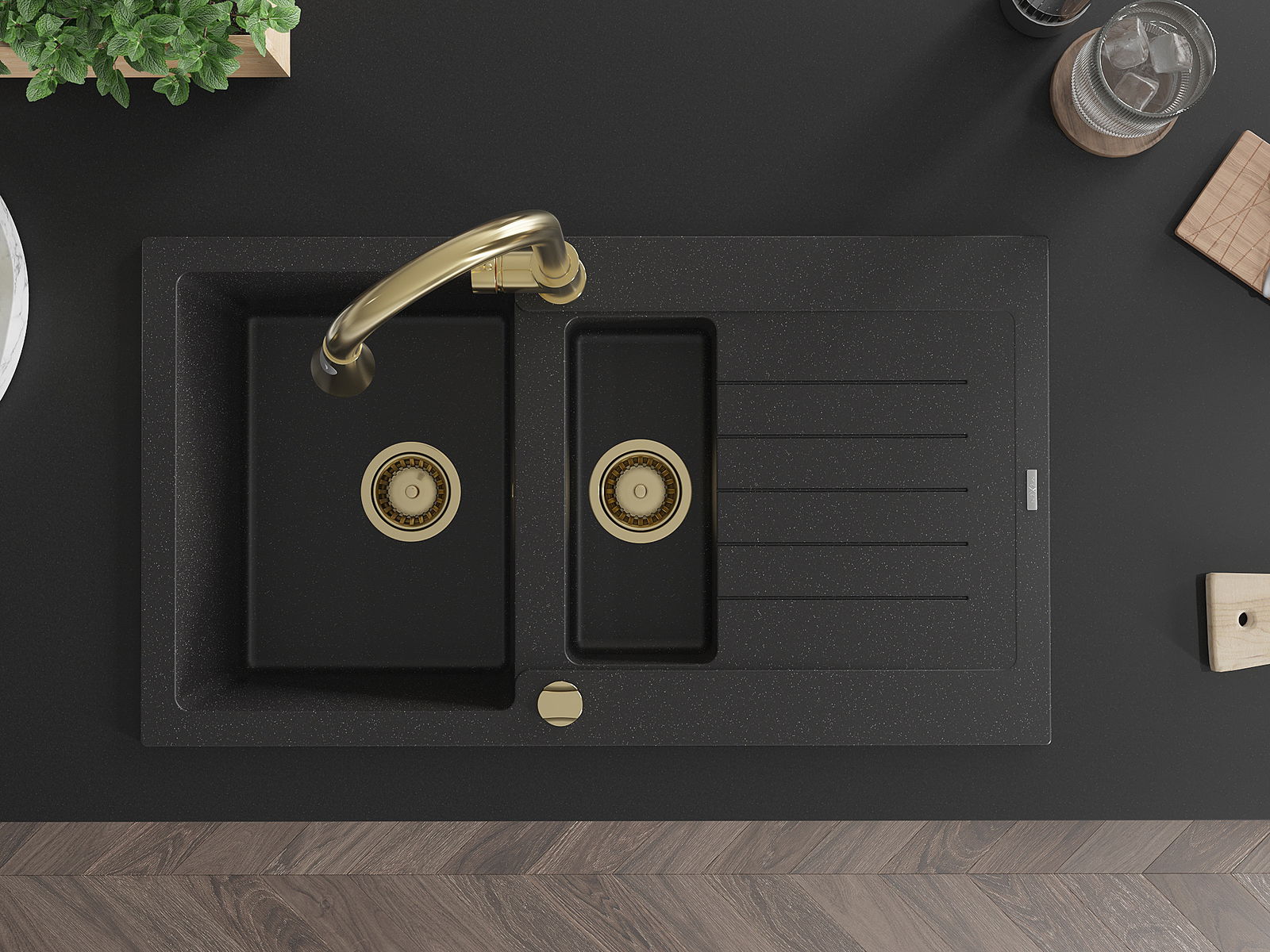Mexen Matias granitový drez 1,5-komorový s odkvapkávacou plochou 900 x 505 mm, čierny/strieborný metalický, sifón zlatý