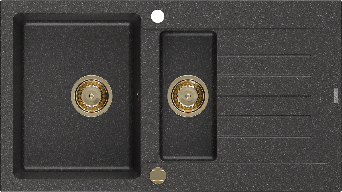 Mexen Matias granitový drez 1,5-komorový s odkvapkávacou doskou 900 x 505 mm, čierny bodkovaný, sifón zlatý - 6502901505-76-G