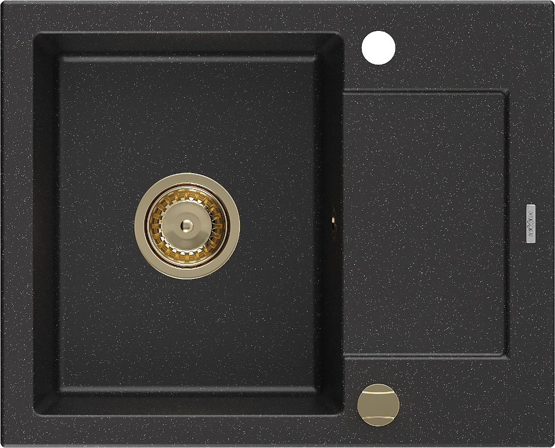 Mexen Enzo žulový drez s 1 komorou a odkvapkávačom 576 x 465 mm, čierny/strieborný metalický, sifón zlatý - 6506571005-73-G