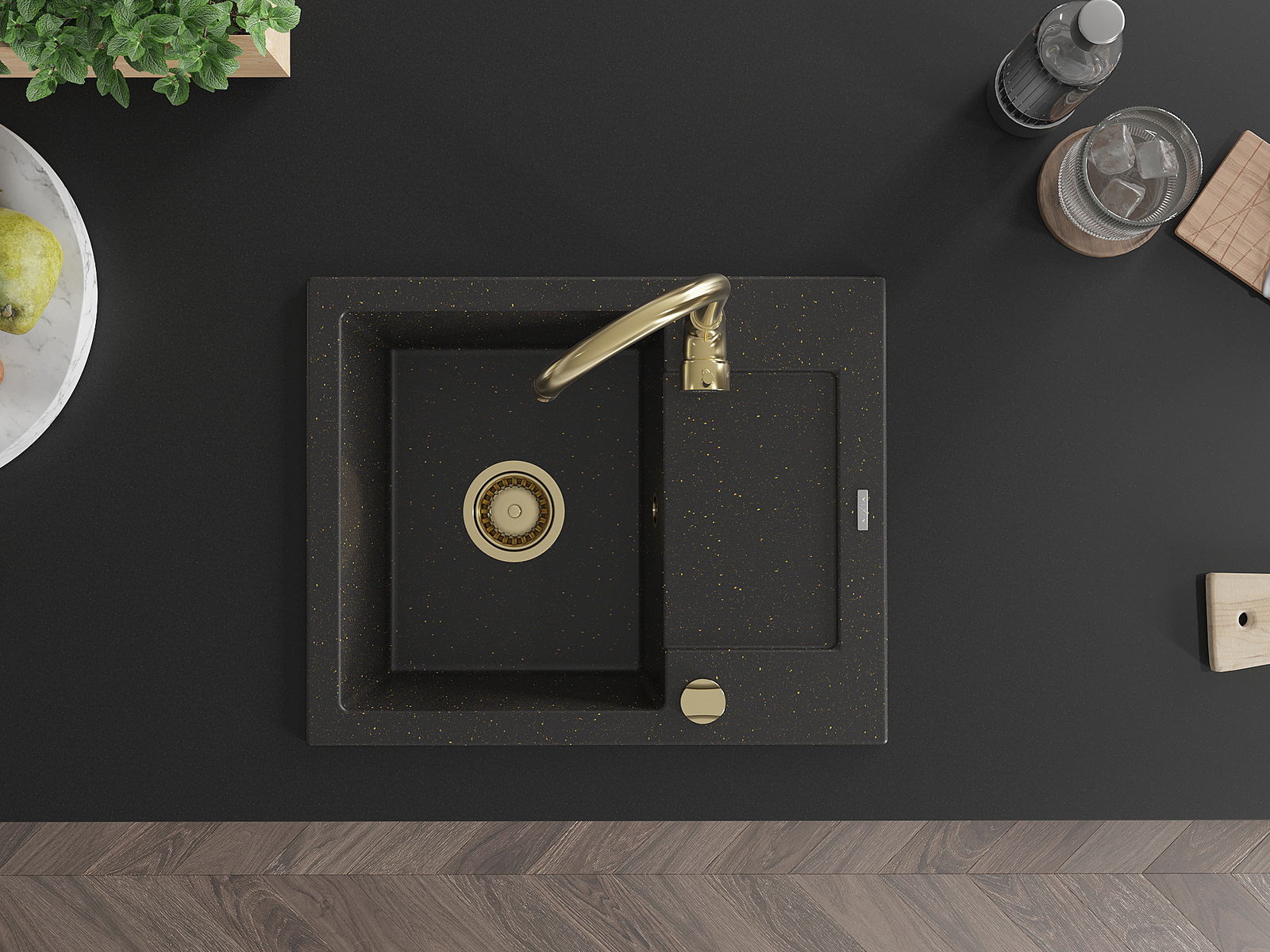 Mexen Enzo granitový drez 1-komorový s odkvapkávacou plochou 576 x 465 mm, čierny/zlatý metalik, sifón zlatý - 6506571005-75-G