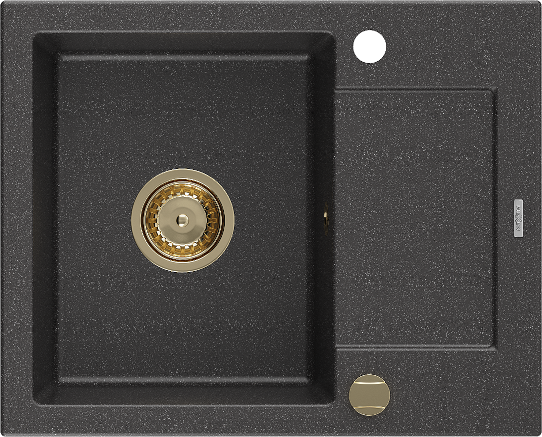 Mexen Enzo žulový kuchynský drez s 1 komorou a odkvapkávačom 576 x 465 mm, čierny postriekaný, zlatený sifón - 6506571005-76-G
