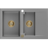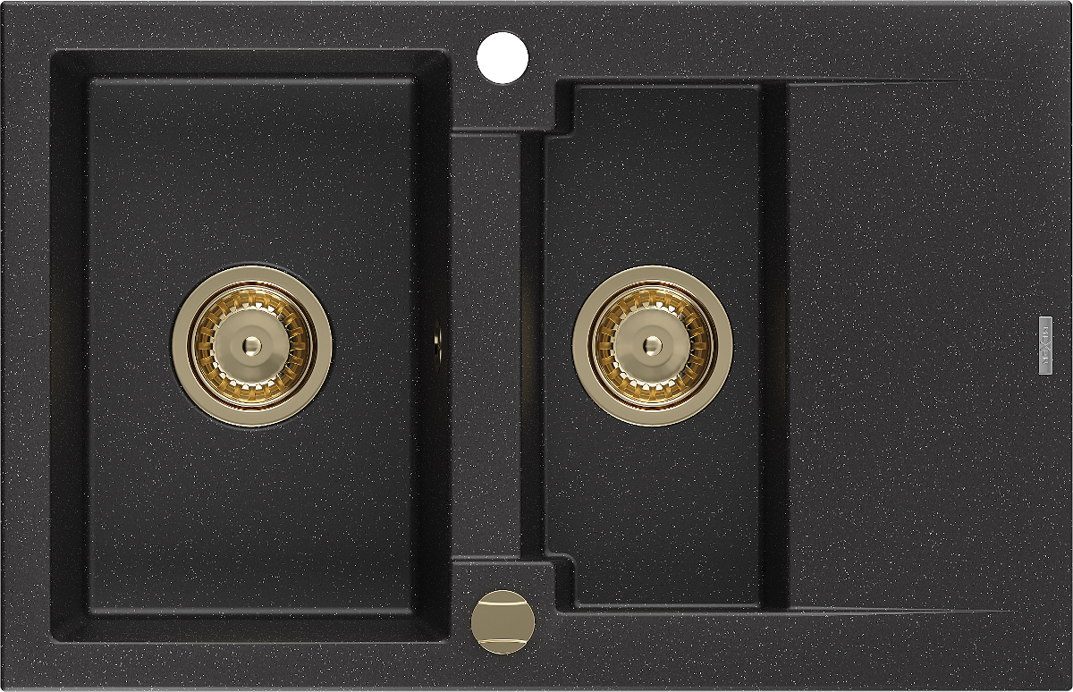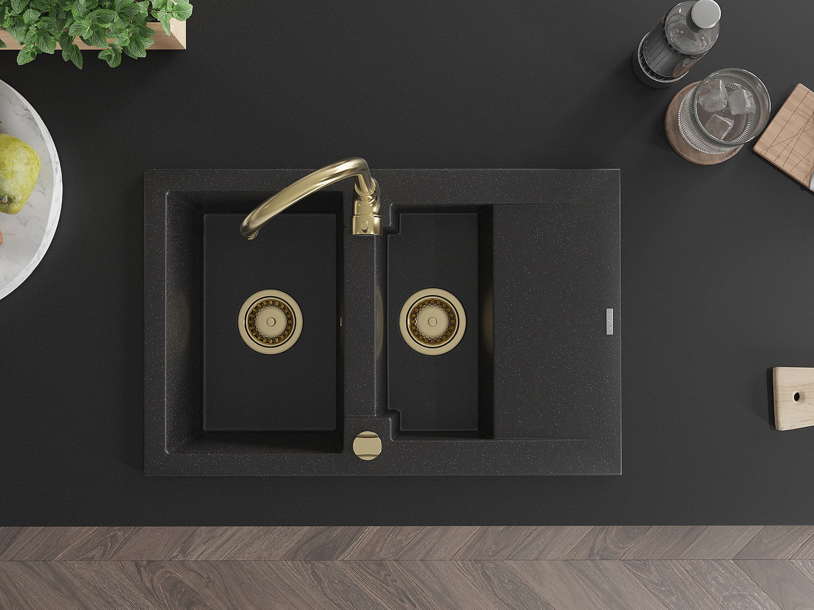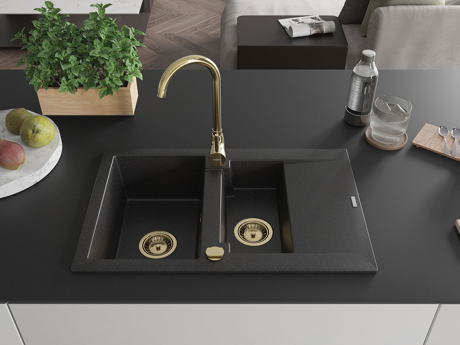 Mexen Gaspar granitový drez 1,5-komorový s odkvapkávačom 737 x 475 mm, čierny/strieborný metalík, sifón zlatý