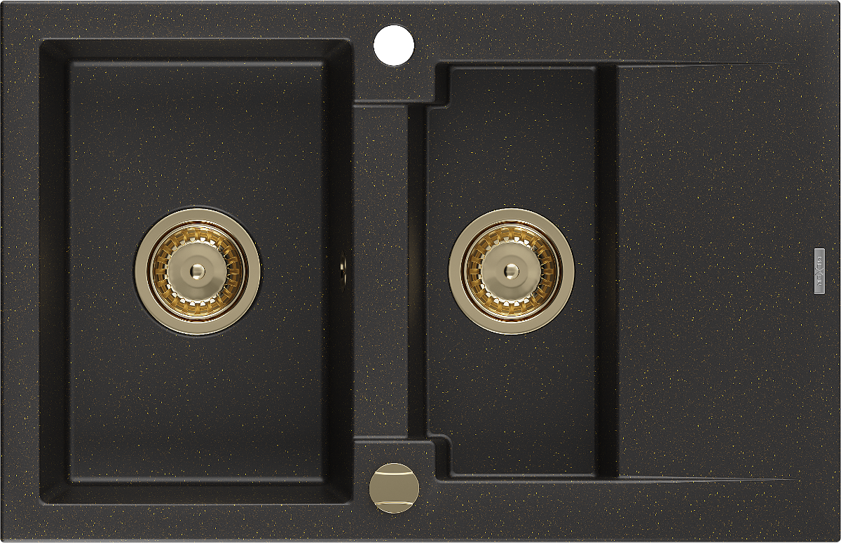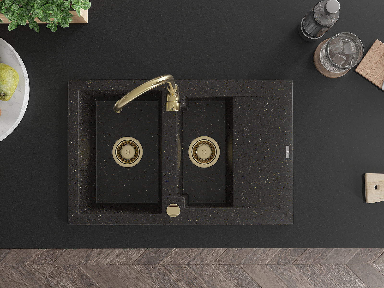 Mexen Gaspar žulový drez s 1,5 komorou a odkvapkávačom 737 x 475 mm, čierny/zlatý metalický, sifón zlatý - 6507731505-75-G