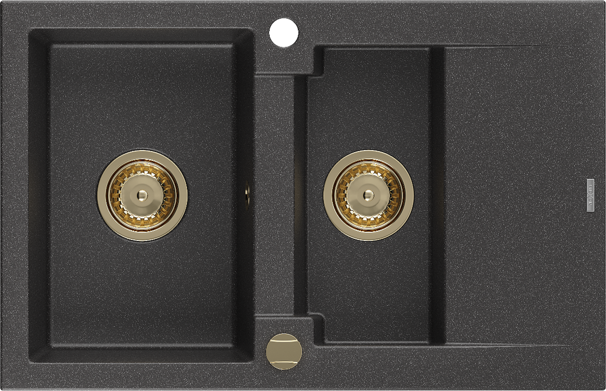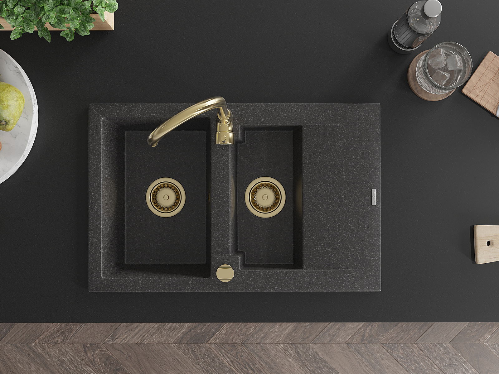 Mexen Gaspar žulový drez 1,5-komorový s odkvapkávačom 737 x 475 mm, čierny škvrnitý, sifón zlatý - 6507731505-76-G