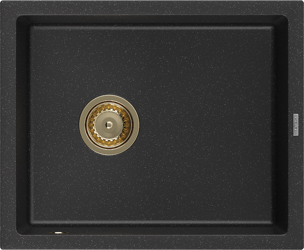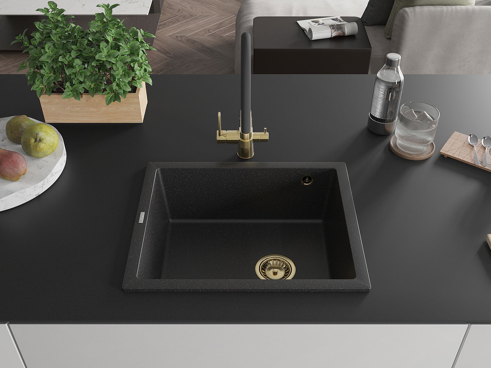 Mexen Pedro žulový kuchynský drez 1-komorový 560 x 460 mm, čierny/strieborný metalik, sifón zlatý - 6508561000-73-G