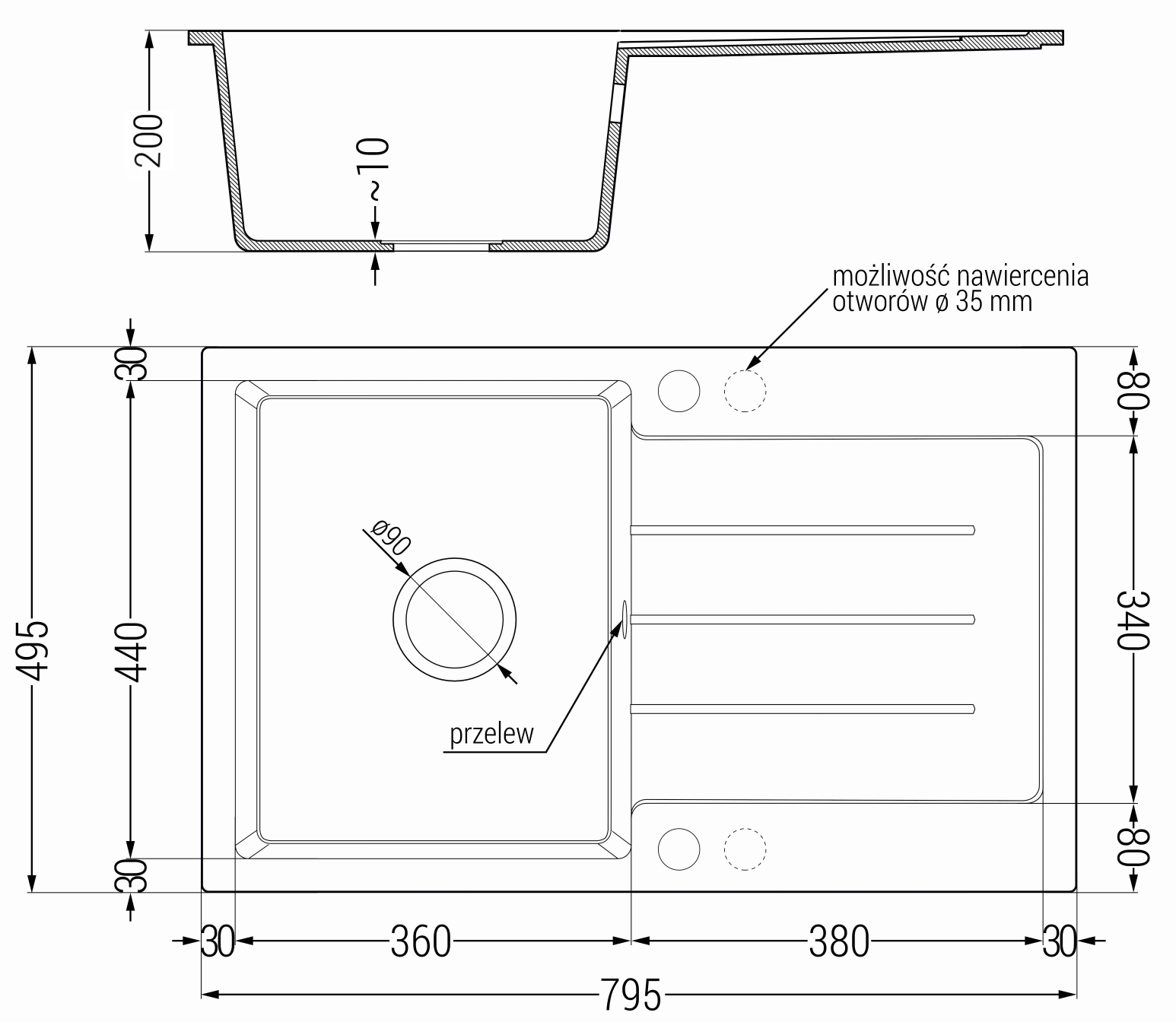Dozkok má 2 spojené diery s priemerom 35 mm, pre seba -burst. Môžu sa okrem iného použiť Na montáž tekutého dávkovača, ktorý eliminuje prítomnosť plastových fliaš v kuchyni a dodá mu elegantný povrch.