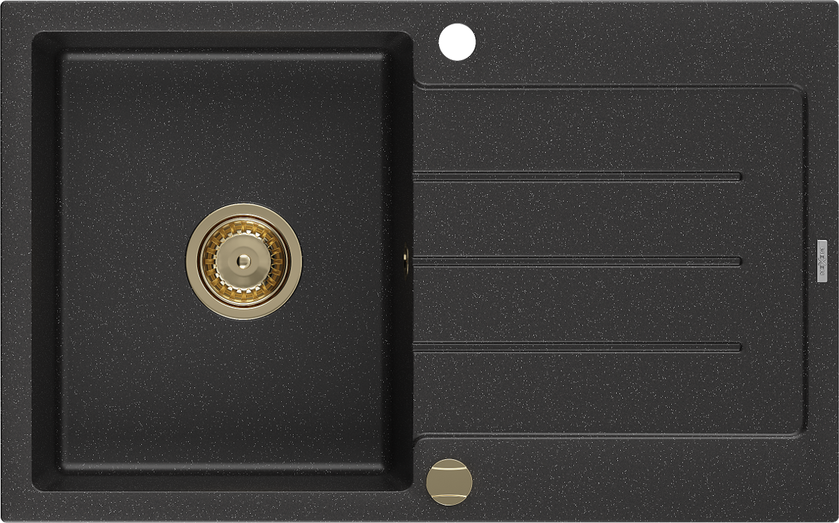 Mexen Bruno žulový drez 1-komorový s odkvapkávačom 795 x 495 mm, čierny/strieborný metalik, sifón zlatý - 6513791010-73-G