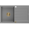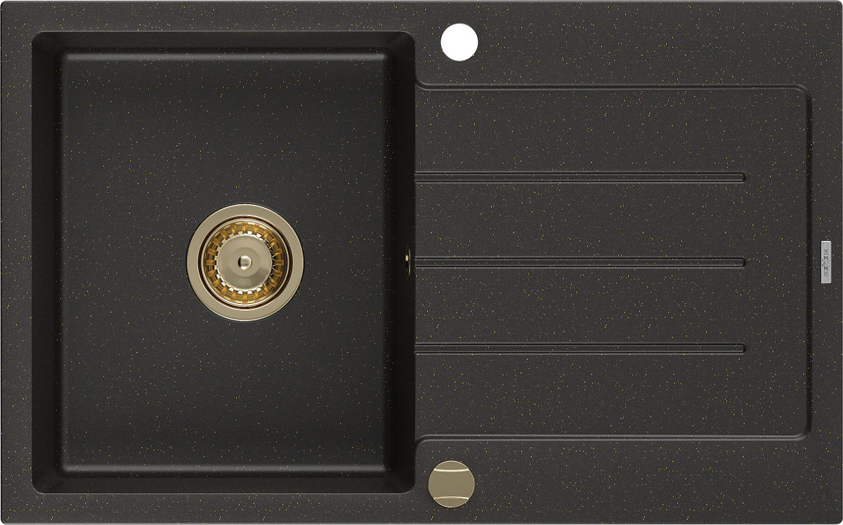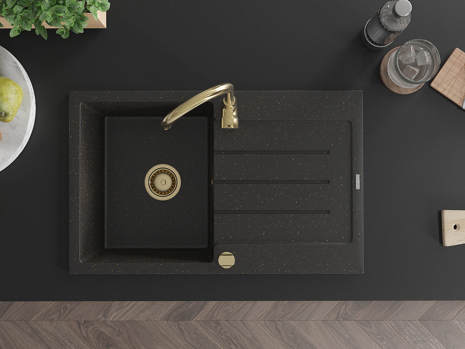 Mexen Bruno granitový drez 1-komorový s odkvapkávačom 795 x 495 mm, čierny/zlatý metalický, sifón zlatý