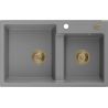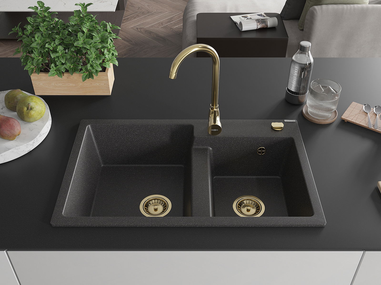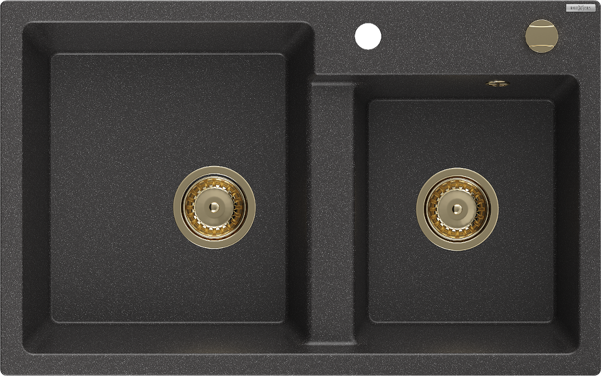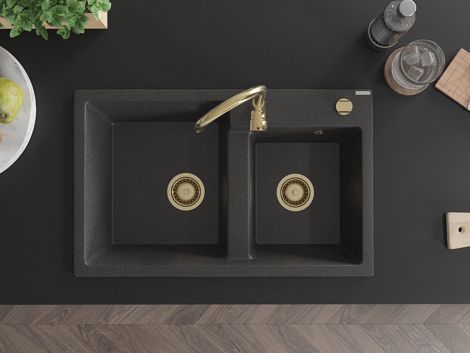 Mexen Tomas žulový drez 2-komorový 800 x 500 mm, čierny škvrnitý, sifón zlatý - 6516802000-76-G