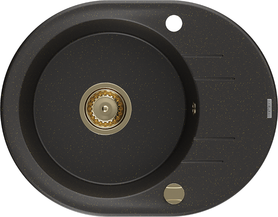 Mexen Kevin granitový drez s jednou komorou a odkvapkávačom 586 x 458 mm, čierny/zlatý metalik, zlatý sifón