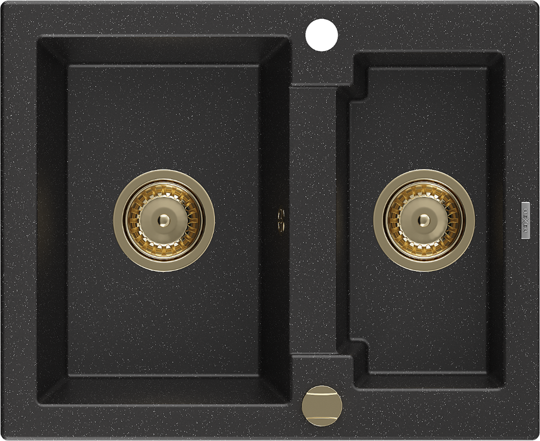 Mexen Carlos granitový drez 1,5-komorový 582 x 475 mm, čierny/strieborný metalik, zlatý sifón - 6518581500-73-G