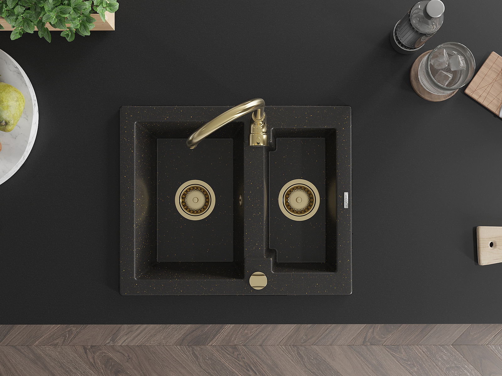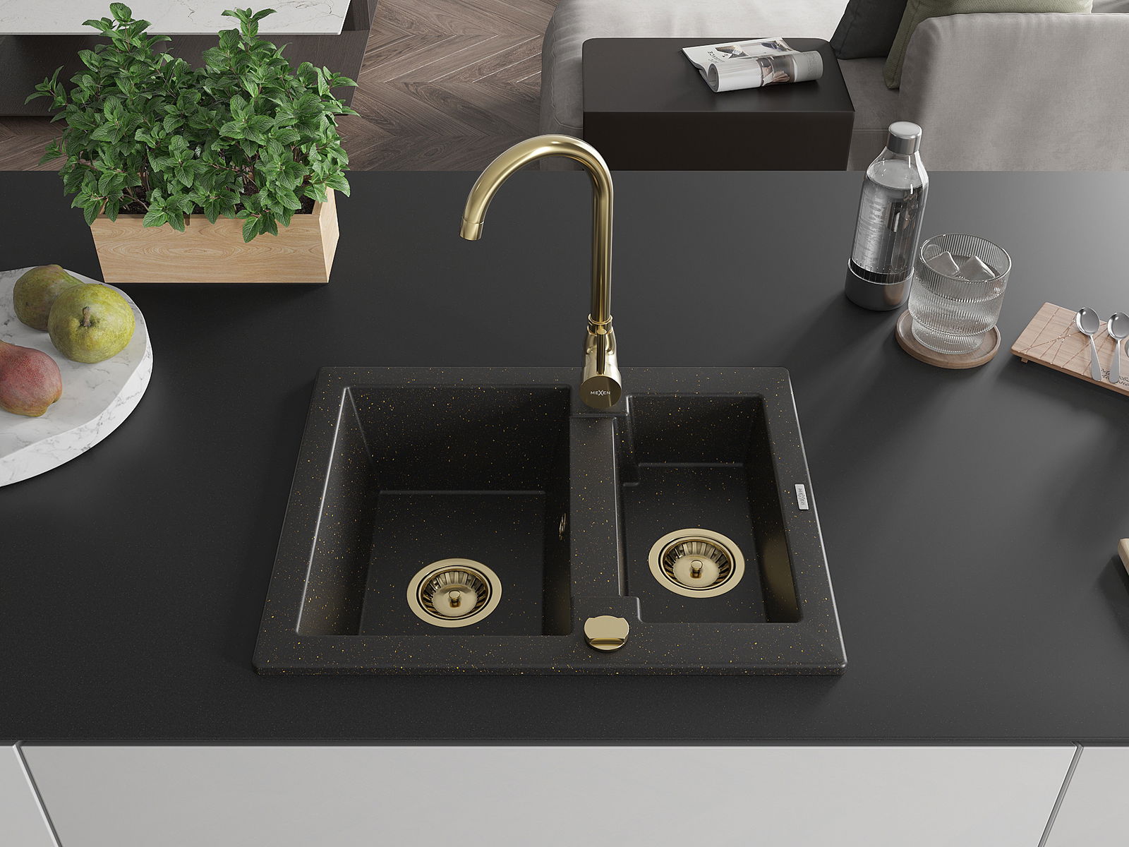 Mexen Carlos granitový drez 1,5-komorový 582 x 475 mm, čierny/zlatý metalik, sifón zlatý - 6518581500-75-G