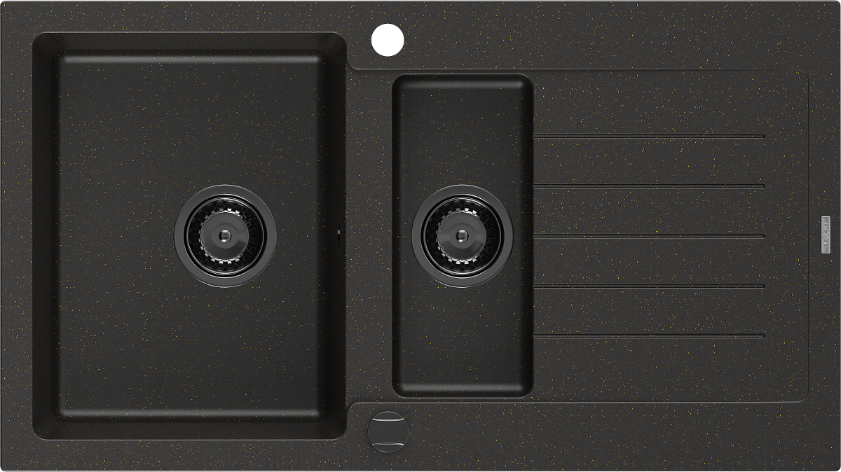 Mexen Matias granitový drez 1,5-komorový s odkvapkávačom 900 x 505 mm, čierny/zlatý metalický, čierny sifón