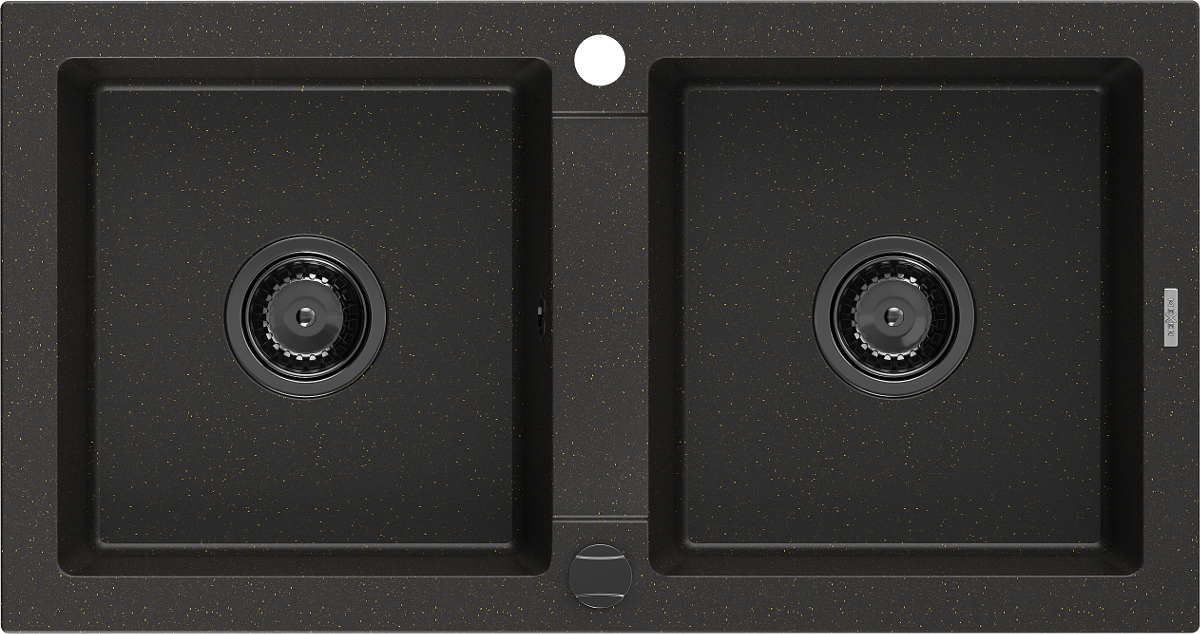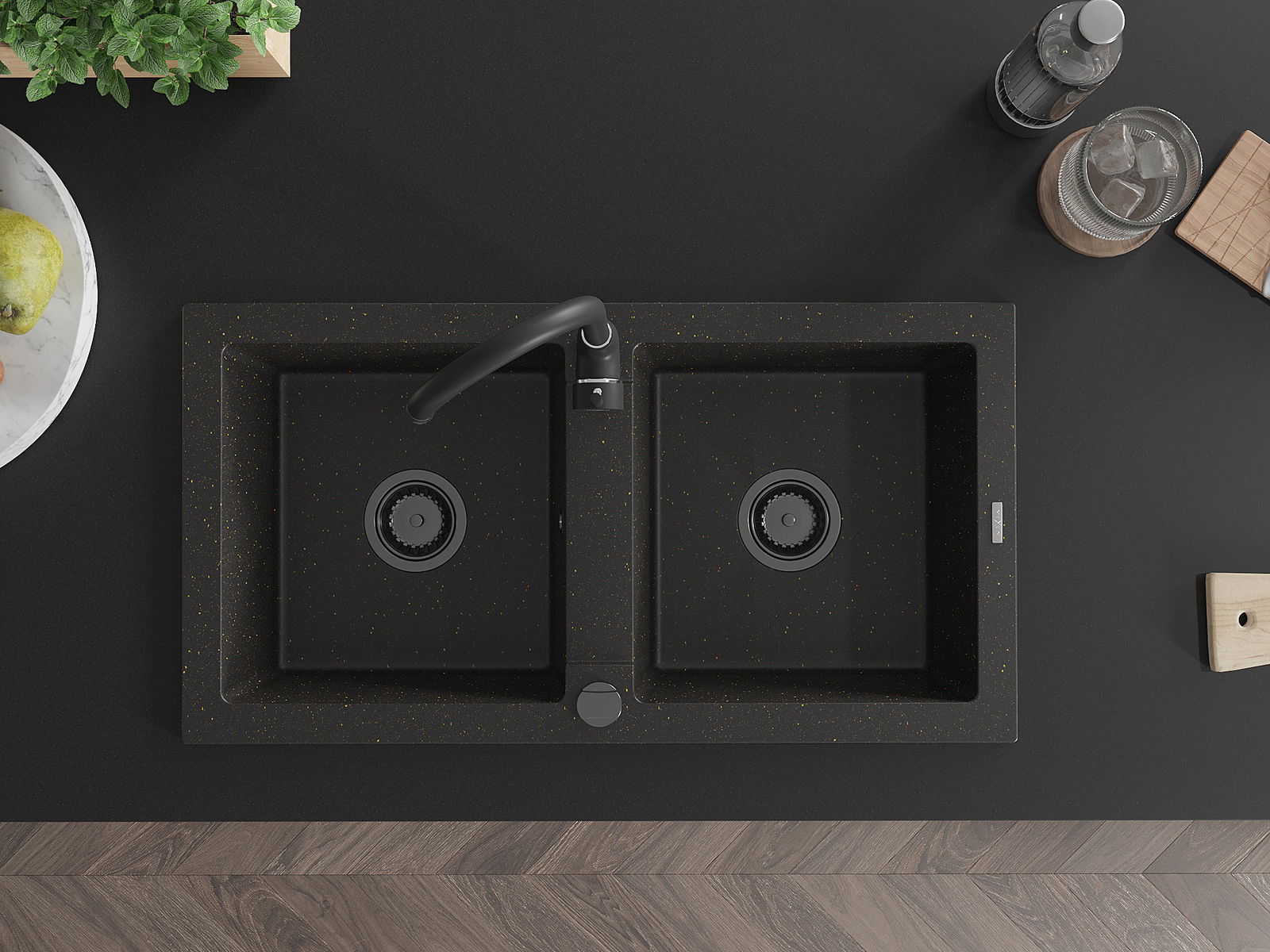 Mexen Mario žulový drez s 2 komorami 820 x 436 mm, čierny/zlatý metalický, čierny sifón - 6504822000-75-B