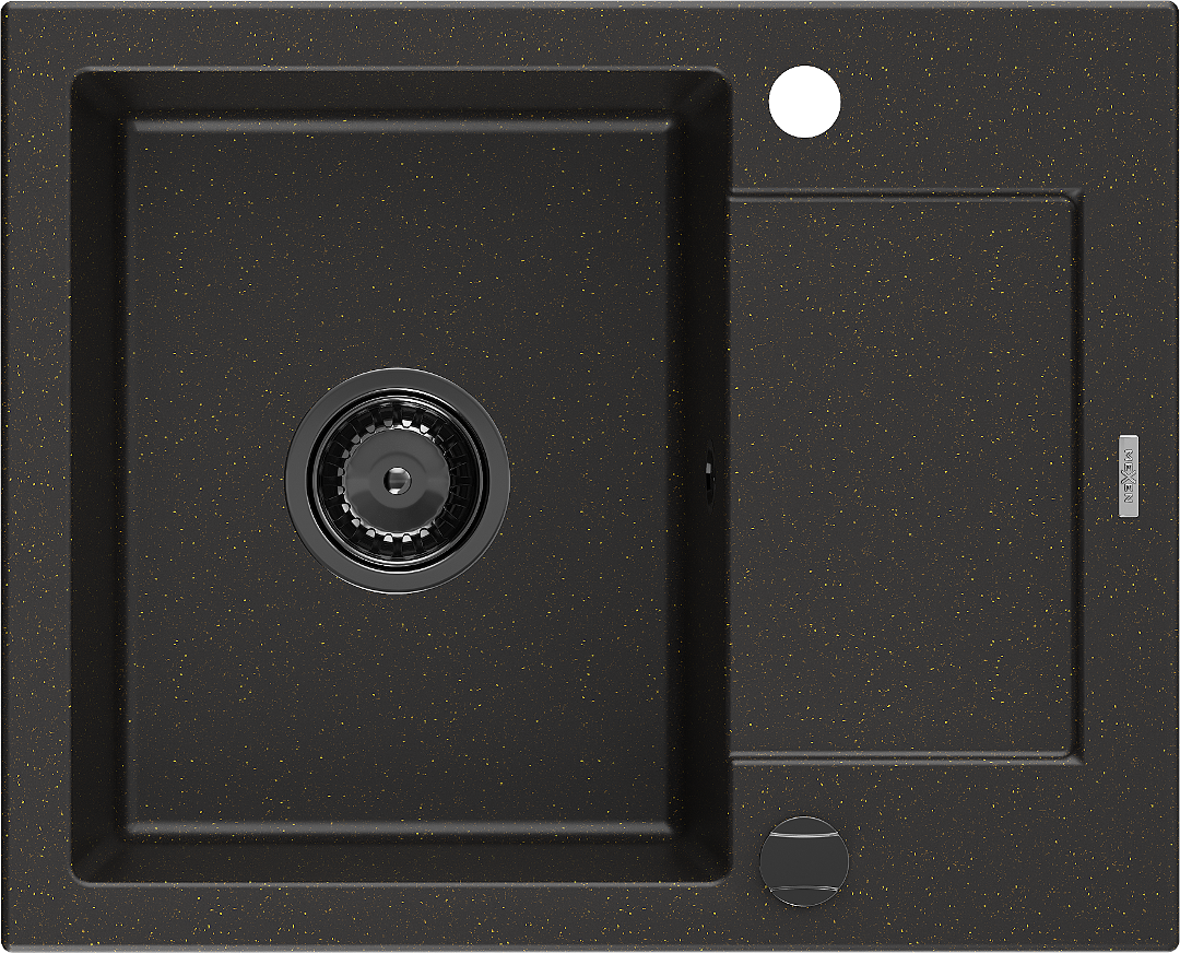 Mexen Enzo žulový drez s 1 komorou a odkladacou plochou 576 x 465 mm, čierny/zlatý metalický, čierny sifón - 6506571005-75-B