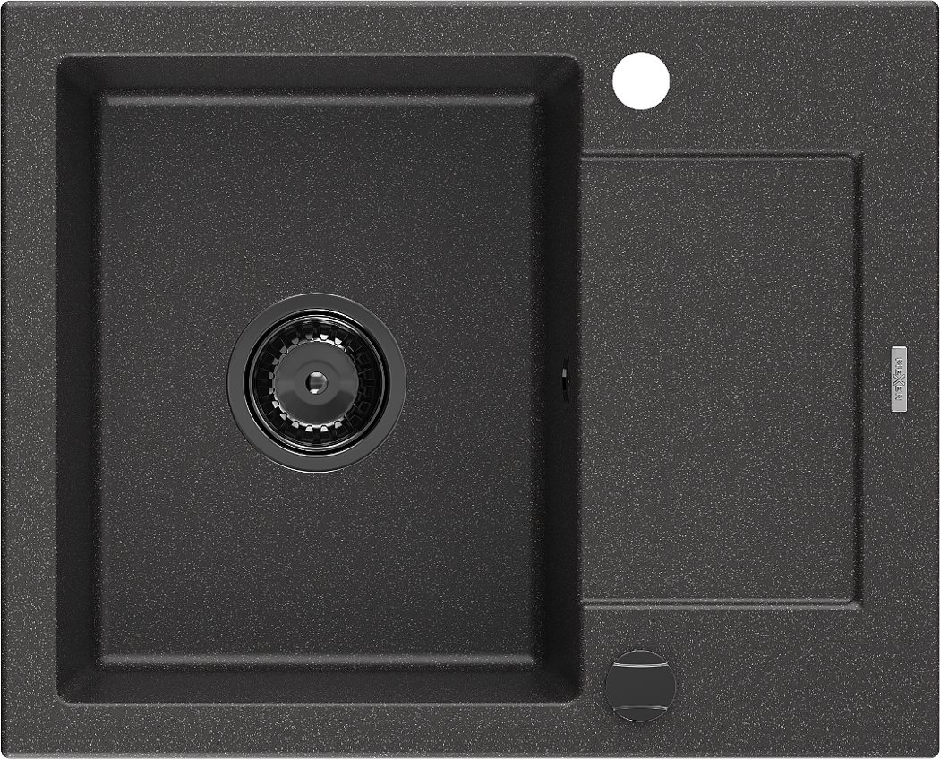 Mexen Enzo granitový drez s 1 komorou a odkvapkávačom 576 x 465 mm, čierny s fľakmi, čierny sifón - 6506571005-76-B