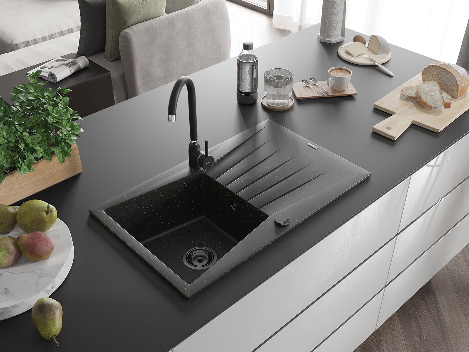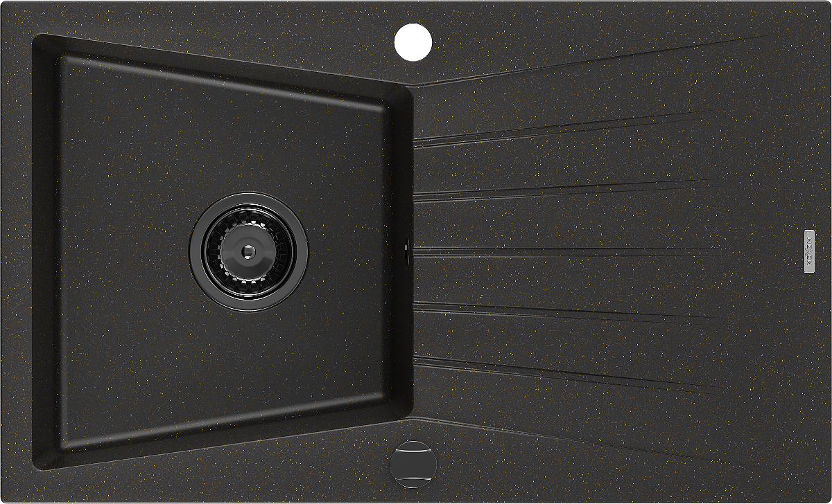 Mexen Cesar žulový drez s 1 komorou a odkvapkávacou plochou 775 x 470 mm, čierny/zlatý metalik, čierny sifón - 6514771010-75-B