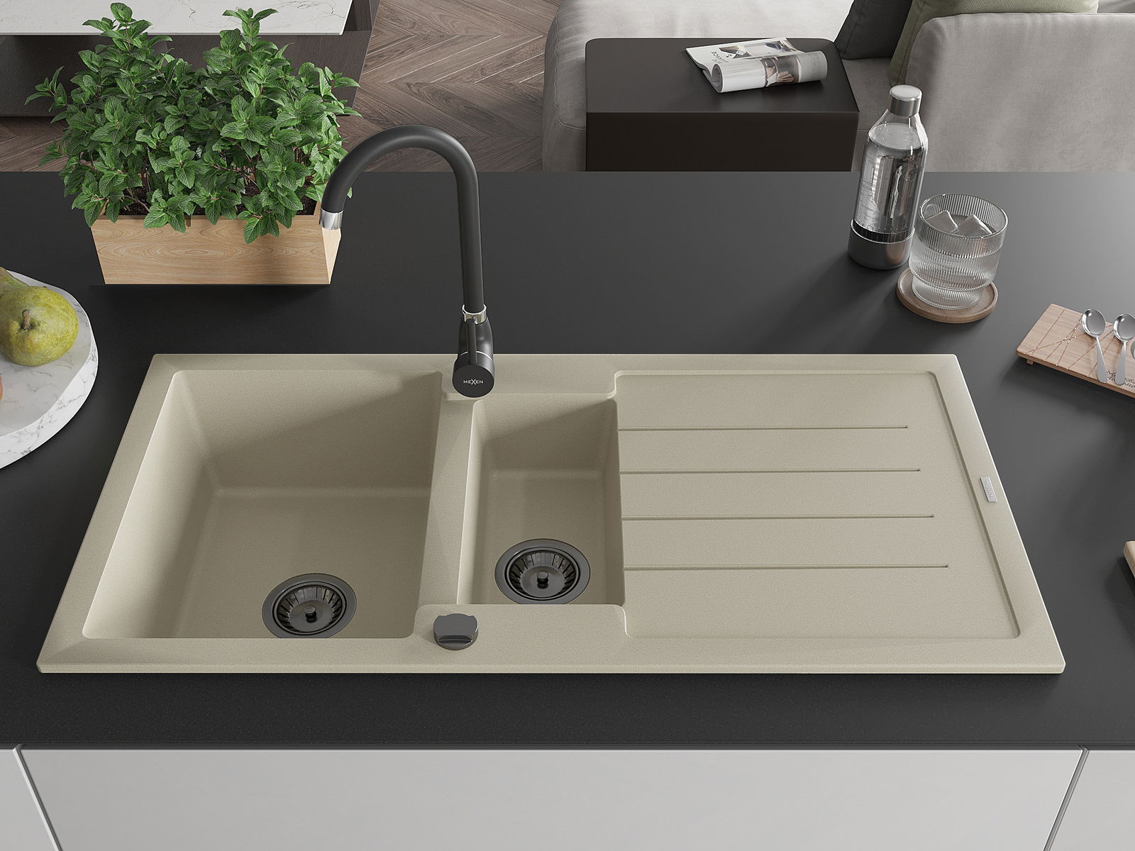 Povrch umývadla je odolný voči škvrnám a sfarbeniu, vďaka čomu sa ľahko čistí a zachováva si svoju farbu po dlhú dobu. Estetický a prakticky dopĺňajúci každú kuchyňu.