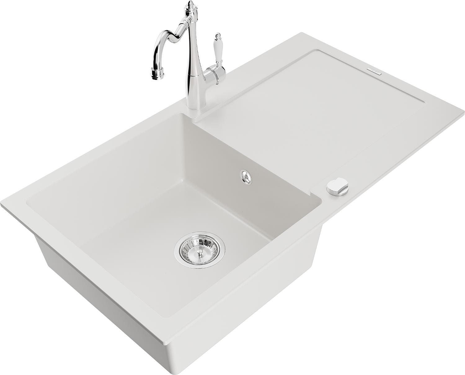 Mexen Leo granitový drez 1-komorový s odkvapkávačom a kuchynskou batériou Carla, biely - 6501-20-670700-00