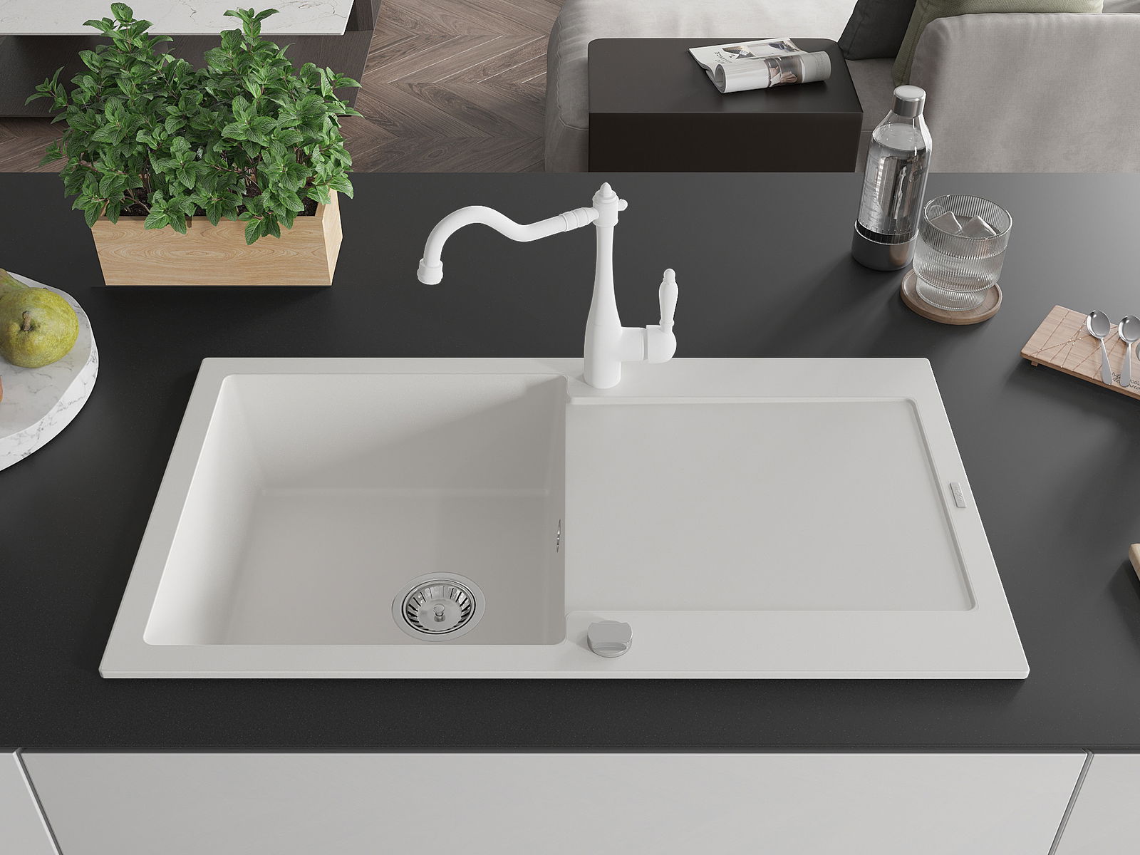 Povrch umývadla je odolný voči škvrnám a sfarbeniu, vďaka čomu sa ľahko čistí a zachováva si svoju farbu po dlhú dobu. Estetický a prakticky dopĺňajúci každú kuchyňu.