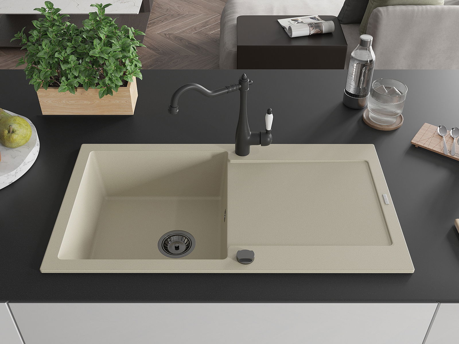 Povrch kuchynského drezu je odolný voči škvrnám a zafarbeniu, vďaka čomu sa ľahko udržiava a zachováva svoju farbu počas dlhého obdobia používania. Estetický a praktický doplnok pre každú kuchyňu.