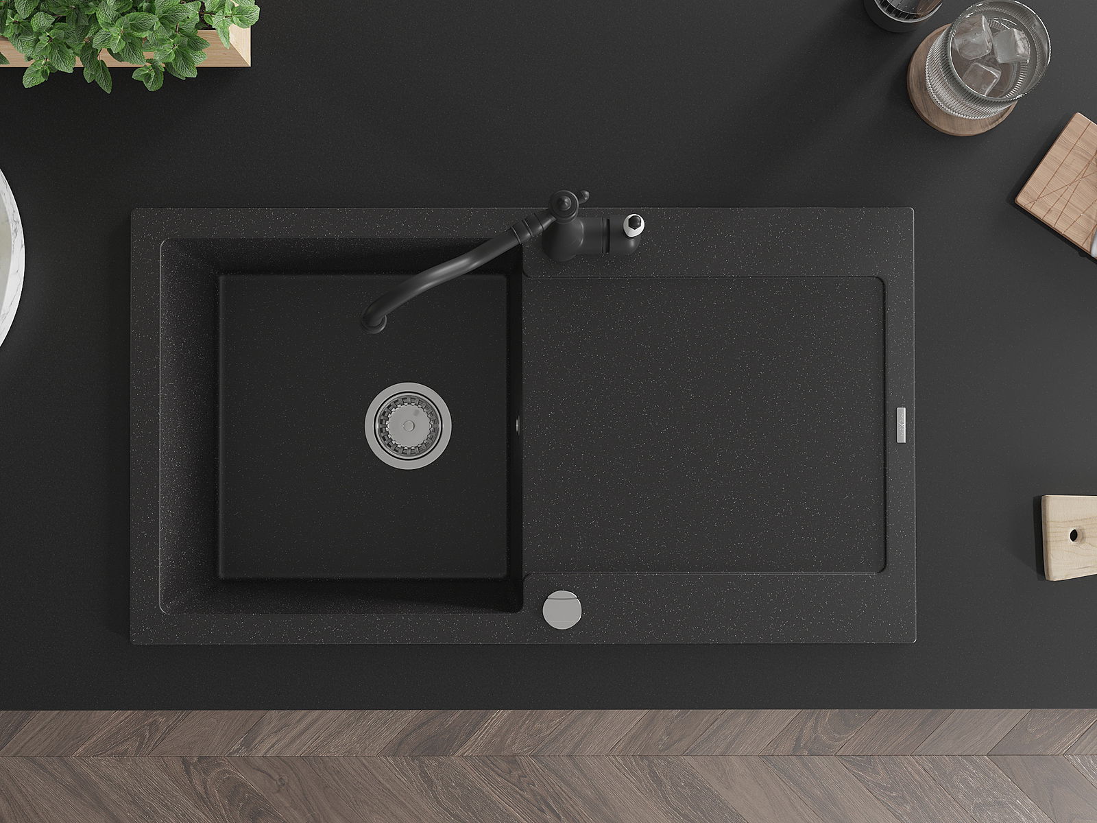 Povrch kuchynského drezu je odolný voči škvrnám a zafarbeniu, vďaka čomu sa ľahko udržiava a zachováva svoju farbu počas dlhého obdobia používania. Estetický a praktický doplnok pre každú kuchyňu.
