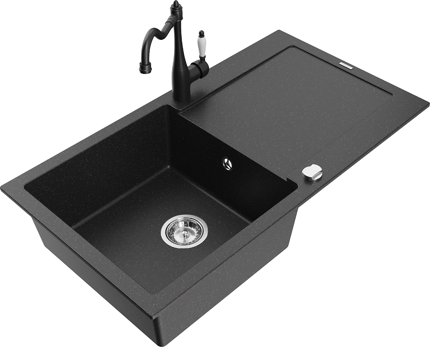 Mexen Leo granitový drez s jednou komorou s odkvapkávačom a kuchynskou batériou Carla, čierny/strieborný metalik