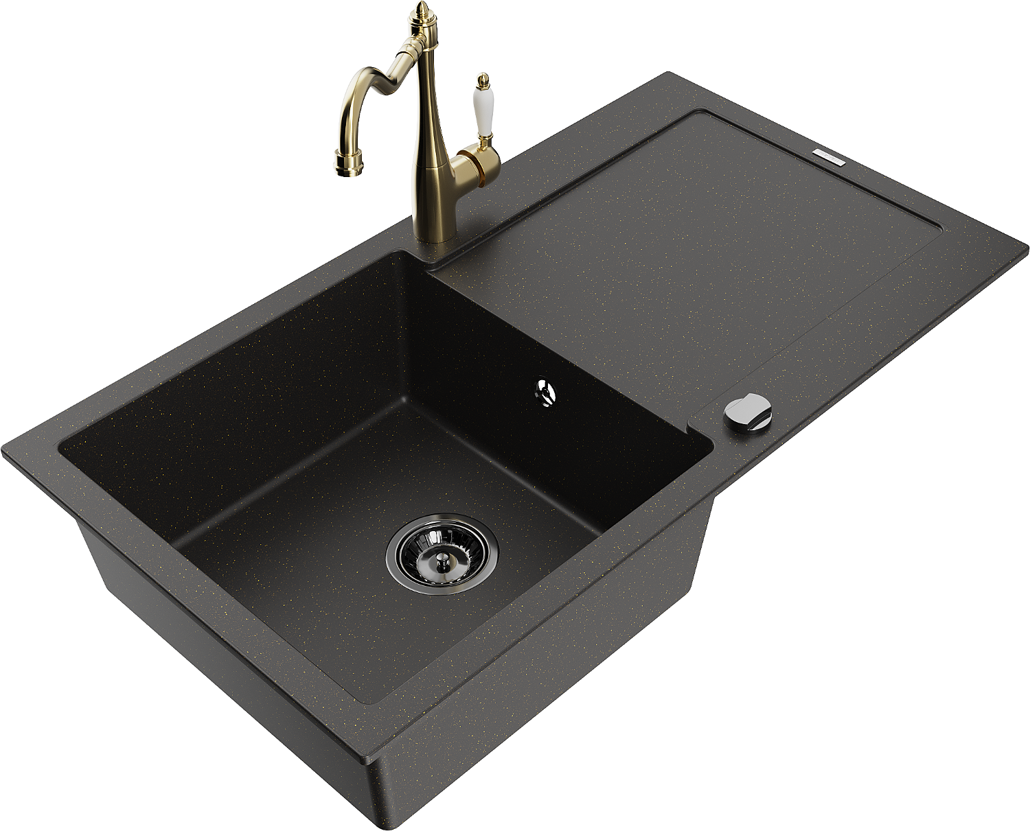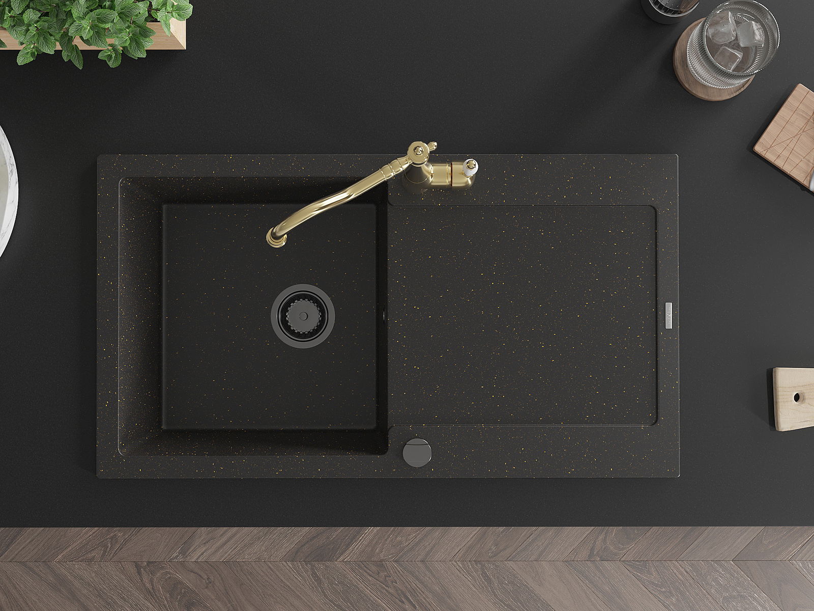 Mexen Leo granitový drez 1-komorový s odkvapkávačom a kuchynskou batériou Carla, čierny/zlatý metalik - 6501-75-670700-50-B