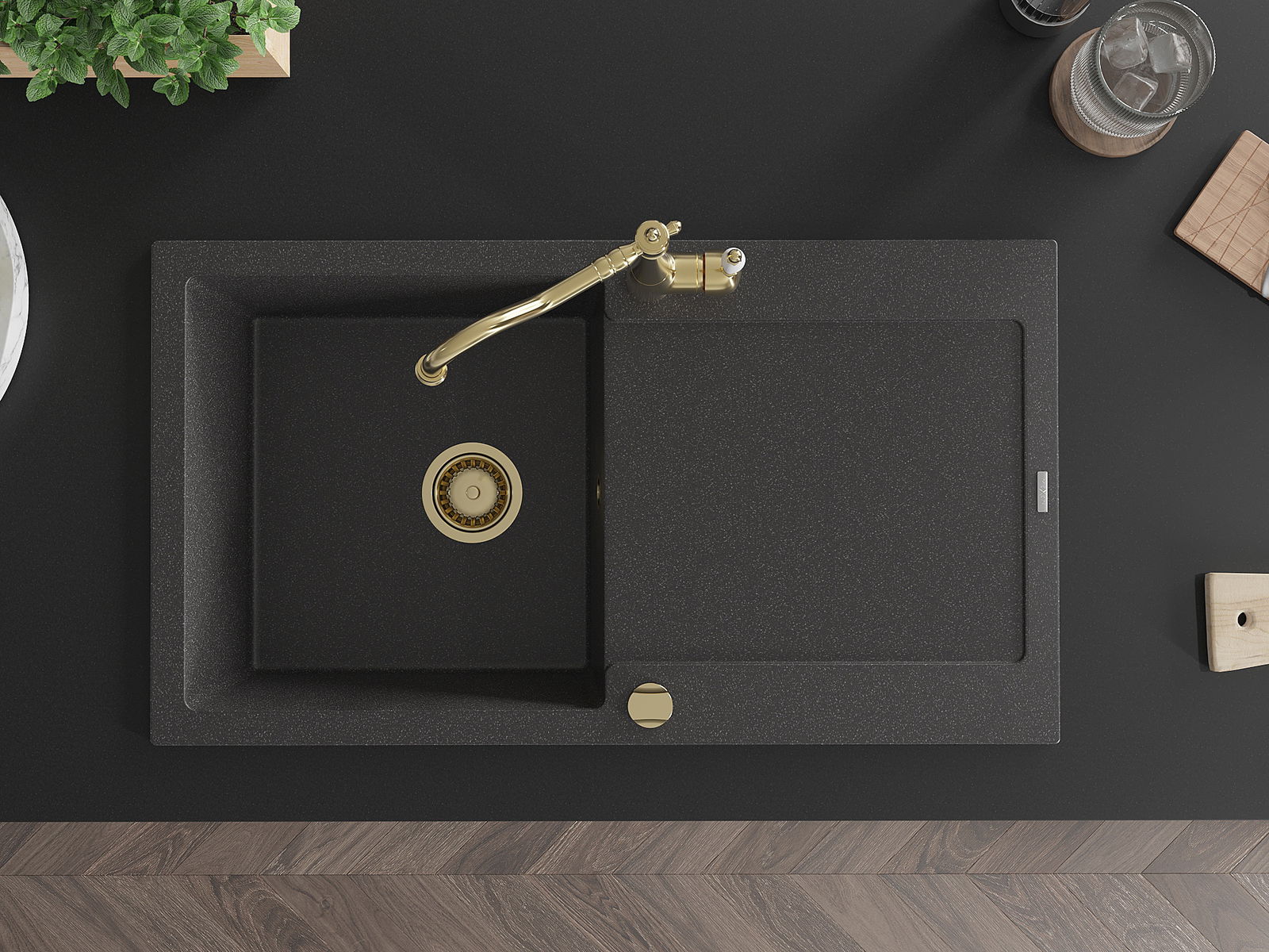 Mexen Leo granitový kuchynský drez 1-komorový s odkvapkávačom a kuchynskou batériou Carla, čierny škvrnitý - 6501-76-670700-50