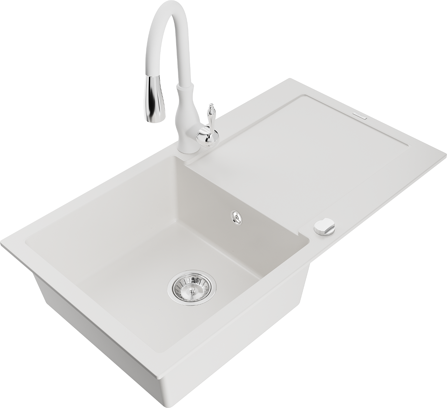 Mexen Leo granitový drez 1-komorový s odkvapkávačom a kuchynskou batériou Savita, biely - 6501-20-672601-20