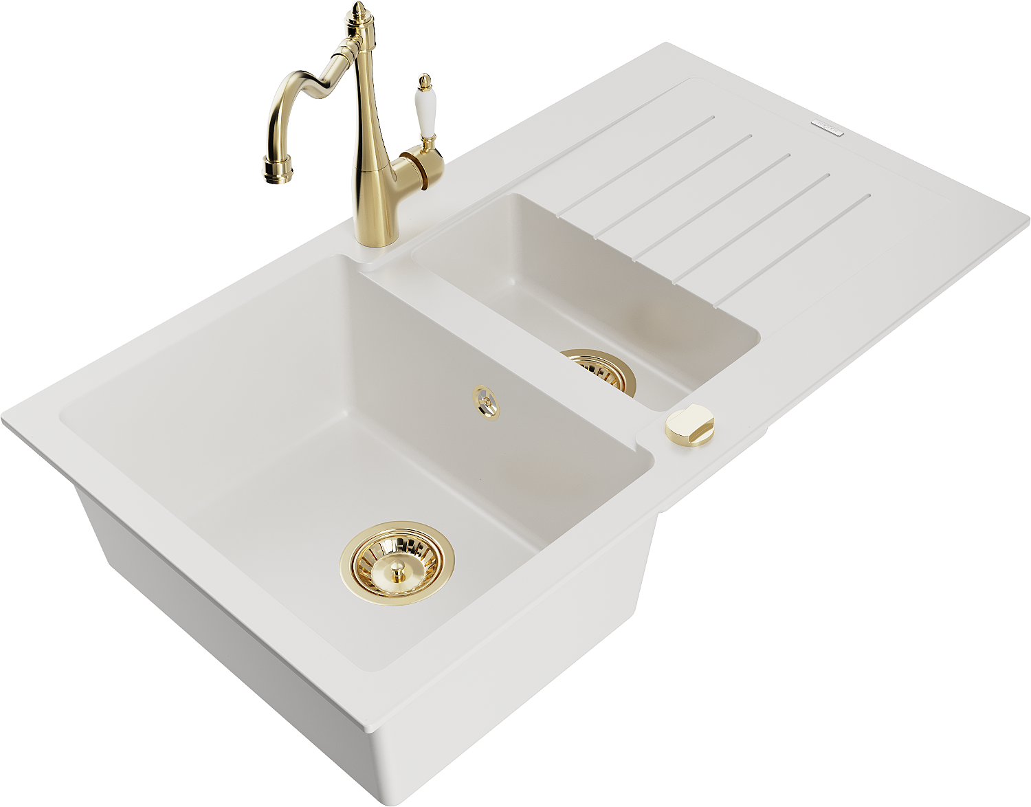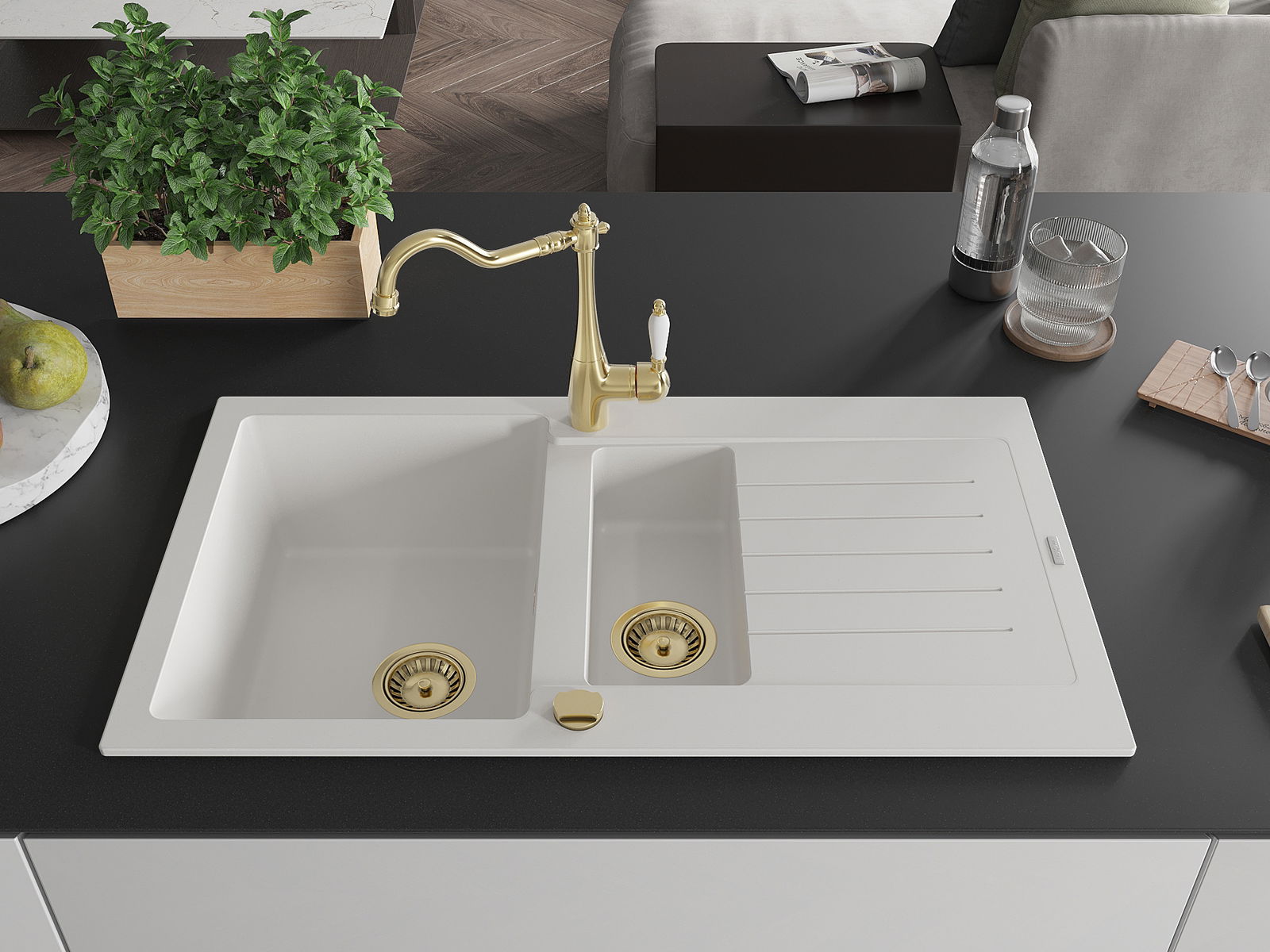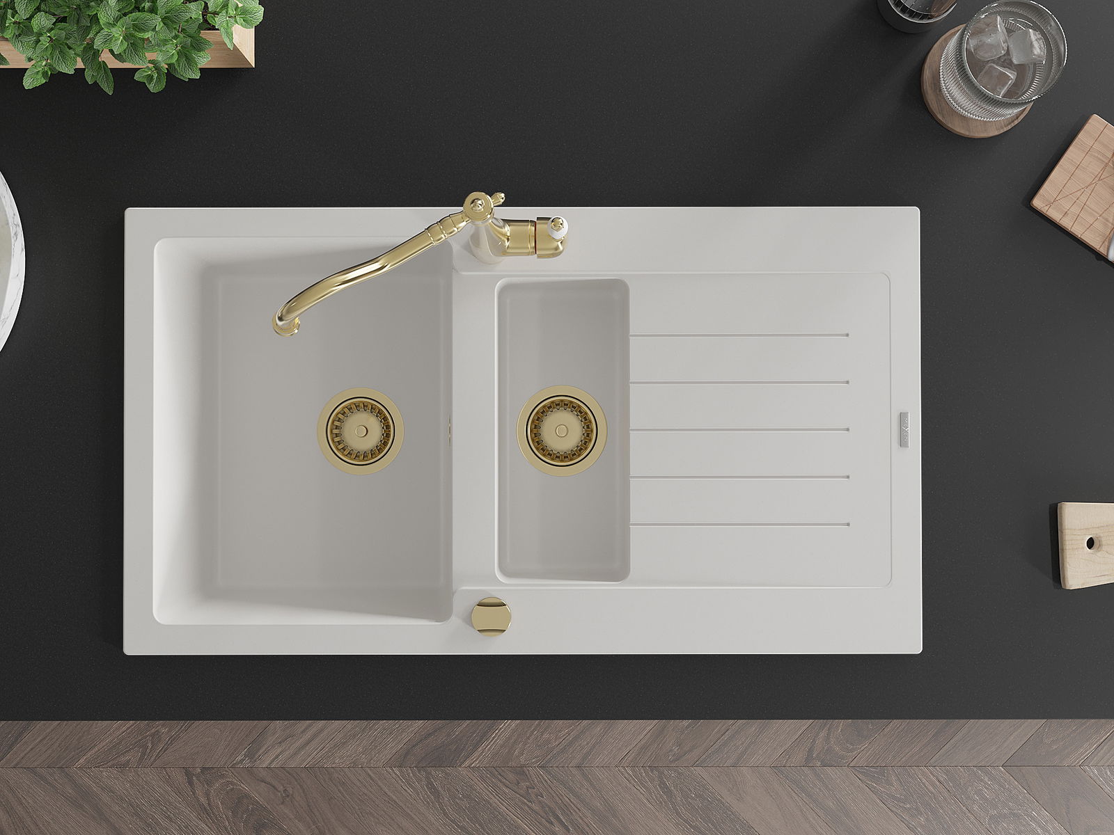 Mexen Matias žulový drez 1,5-komorový s odkvapkávačom a kuchynskou batériou Carla, biely - 6502-20-670700-50