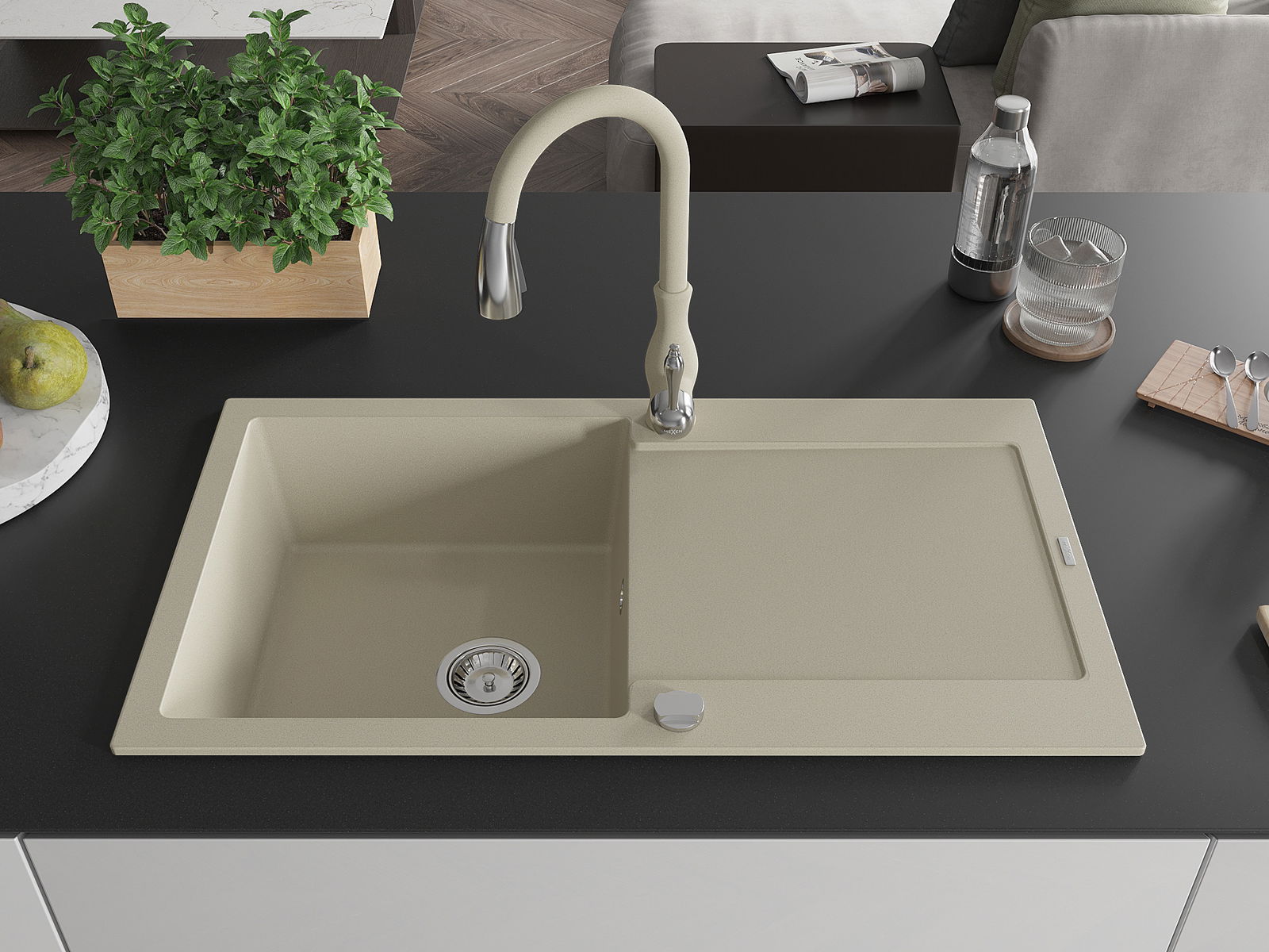 Povrch umývadla je odolný voči škvrnám a sfarbeniu, vďaka čomu sa ľahko čistí a zachováva si svoju farbu po dlhú dobu. Estetický a prakticky dopĺňajúci každú kuchyňu.