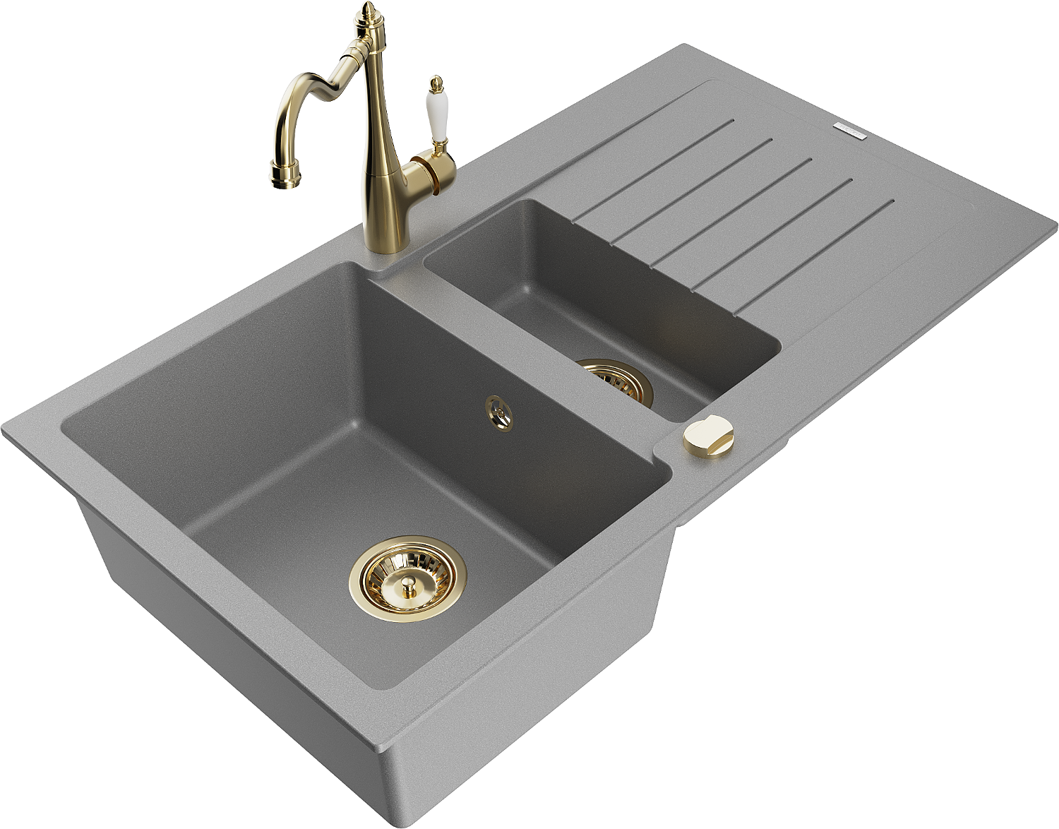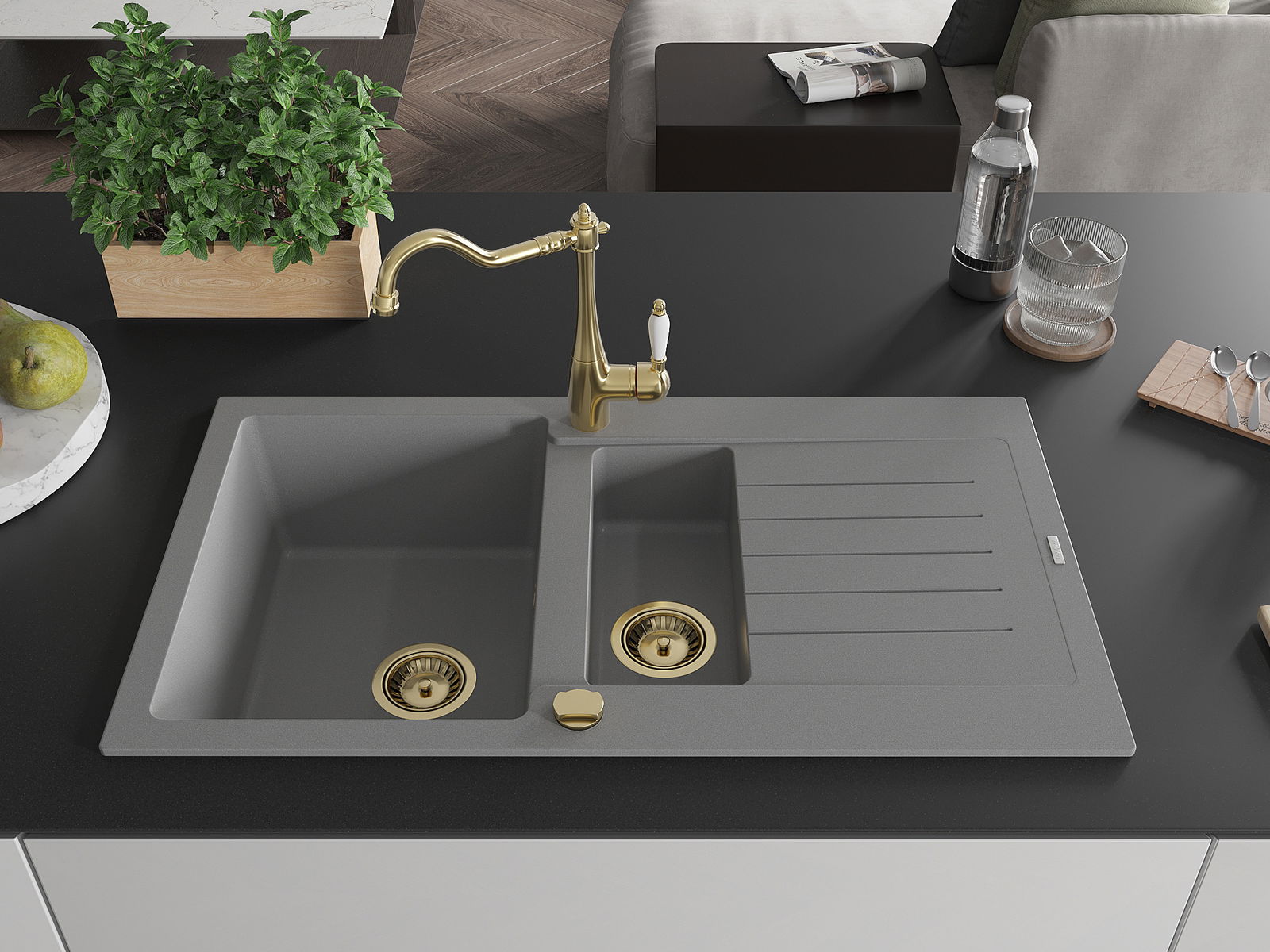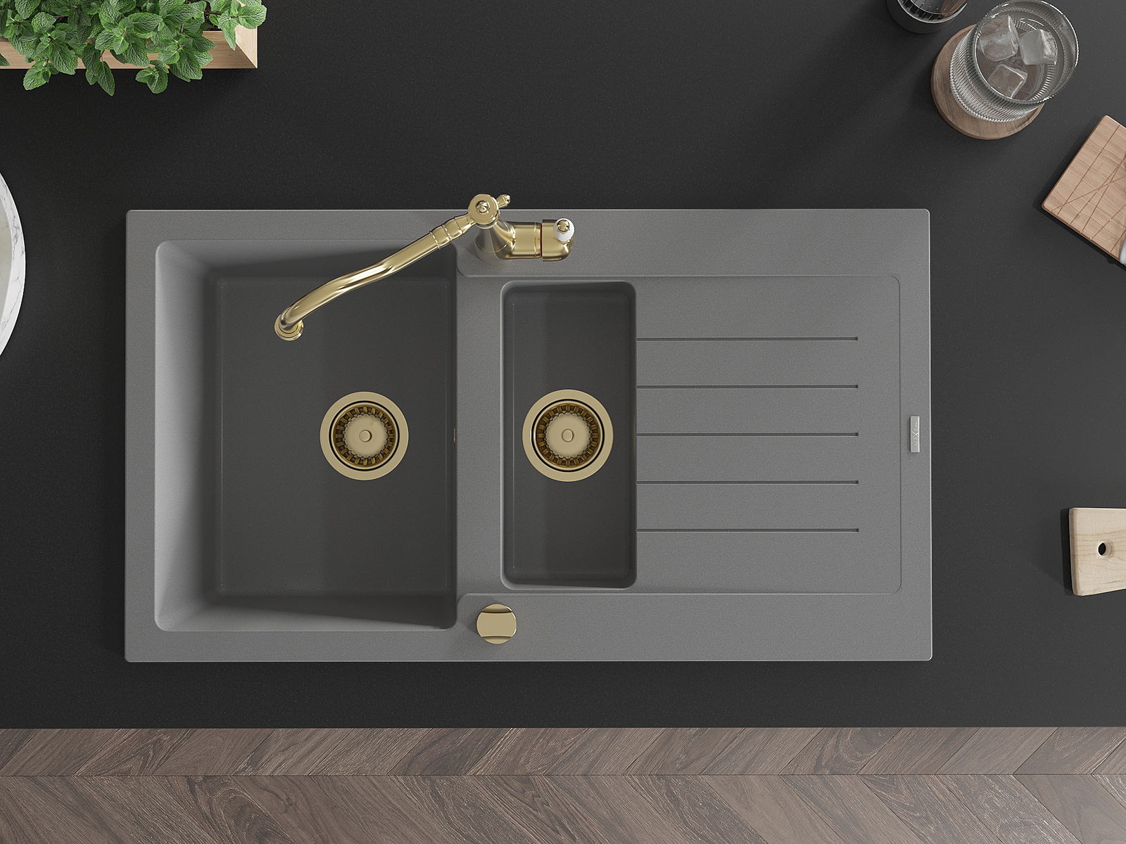 Mexen Matias žulový drez 1,5-komorový s odkvapkávačom a kuchynskou batériou Carla, šedý - 6502-71-670700-50