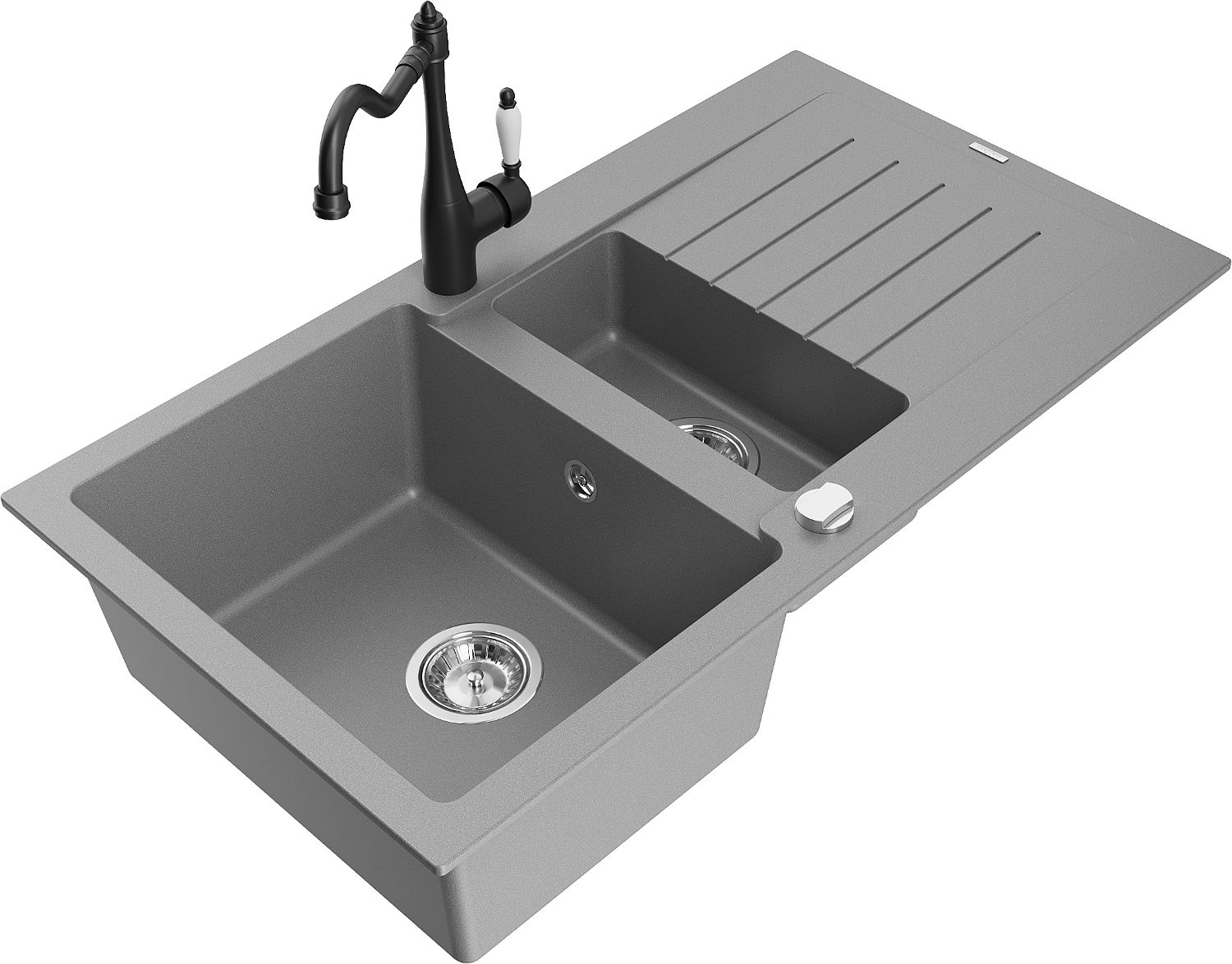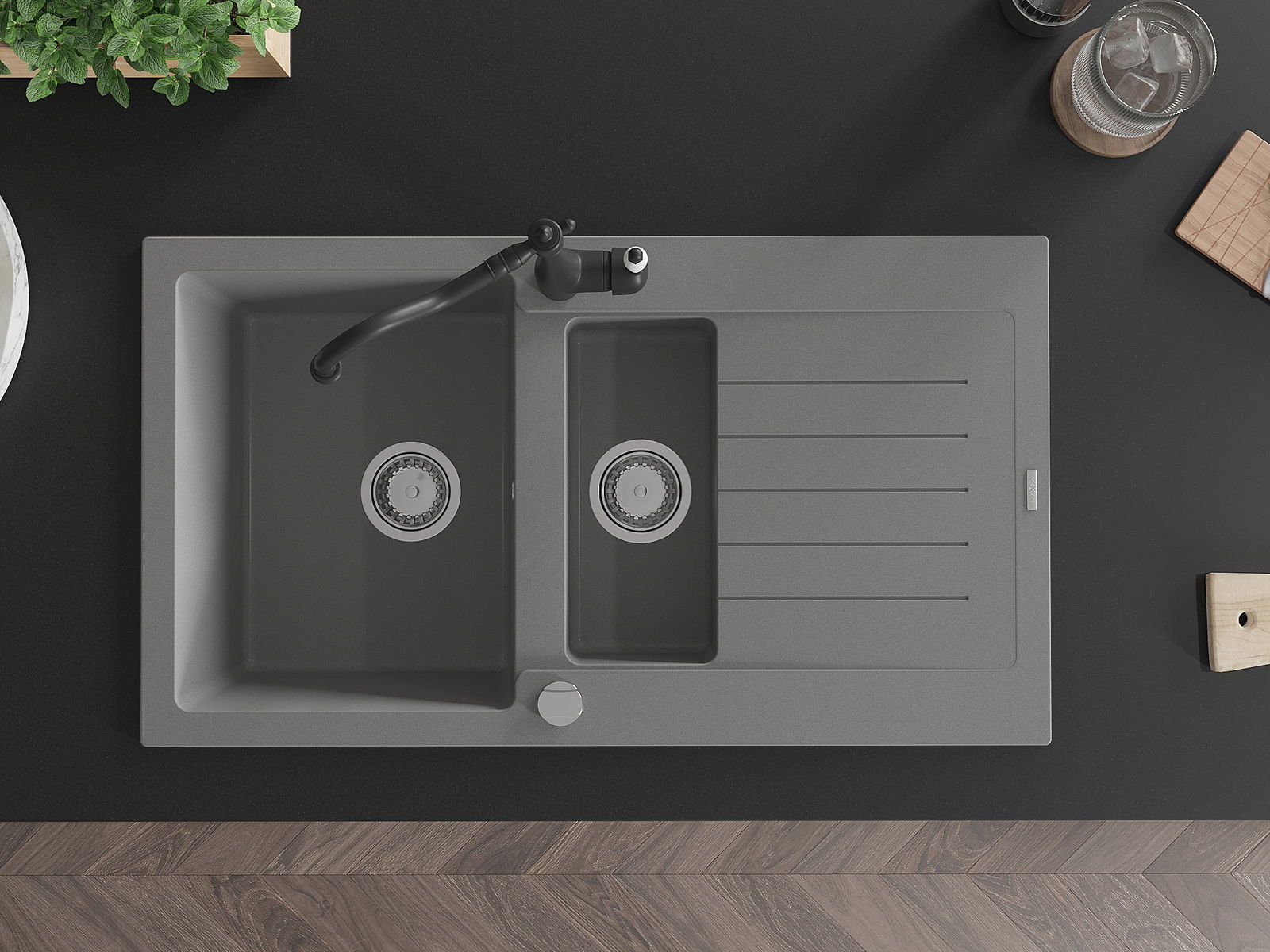 Mexen Matias granitový drez 1,5-komorový s odkvapkávačom a kuchynskou batériou Carla, šedý - 6502-71-670700-70