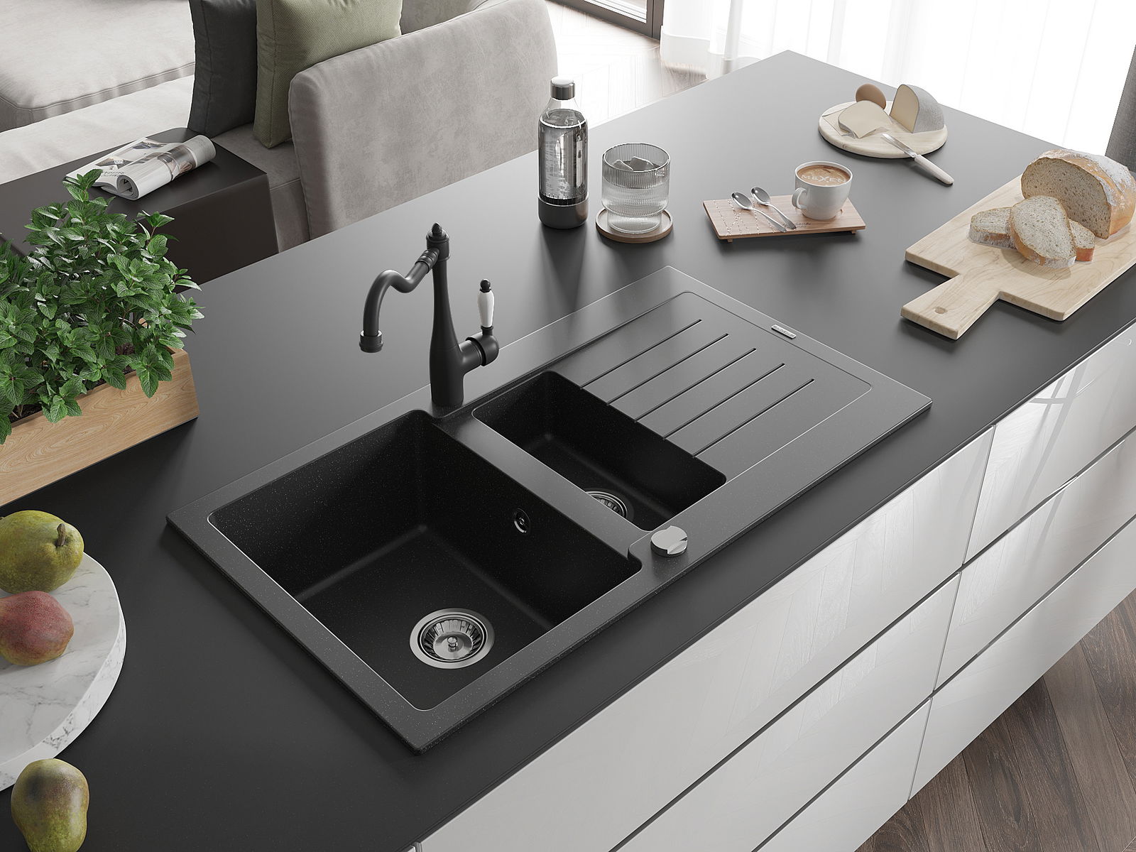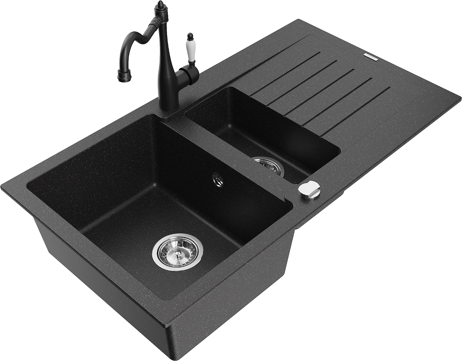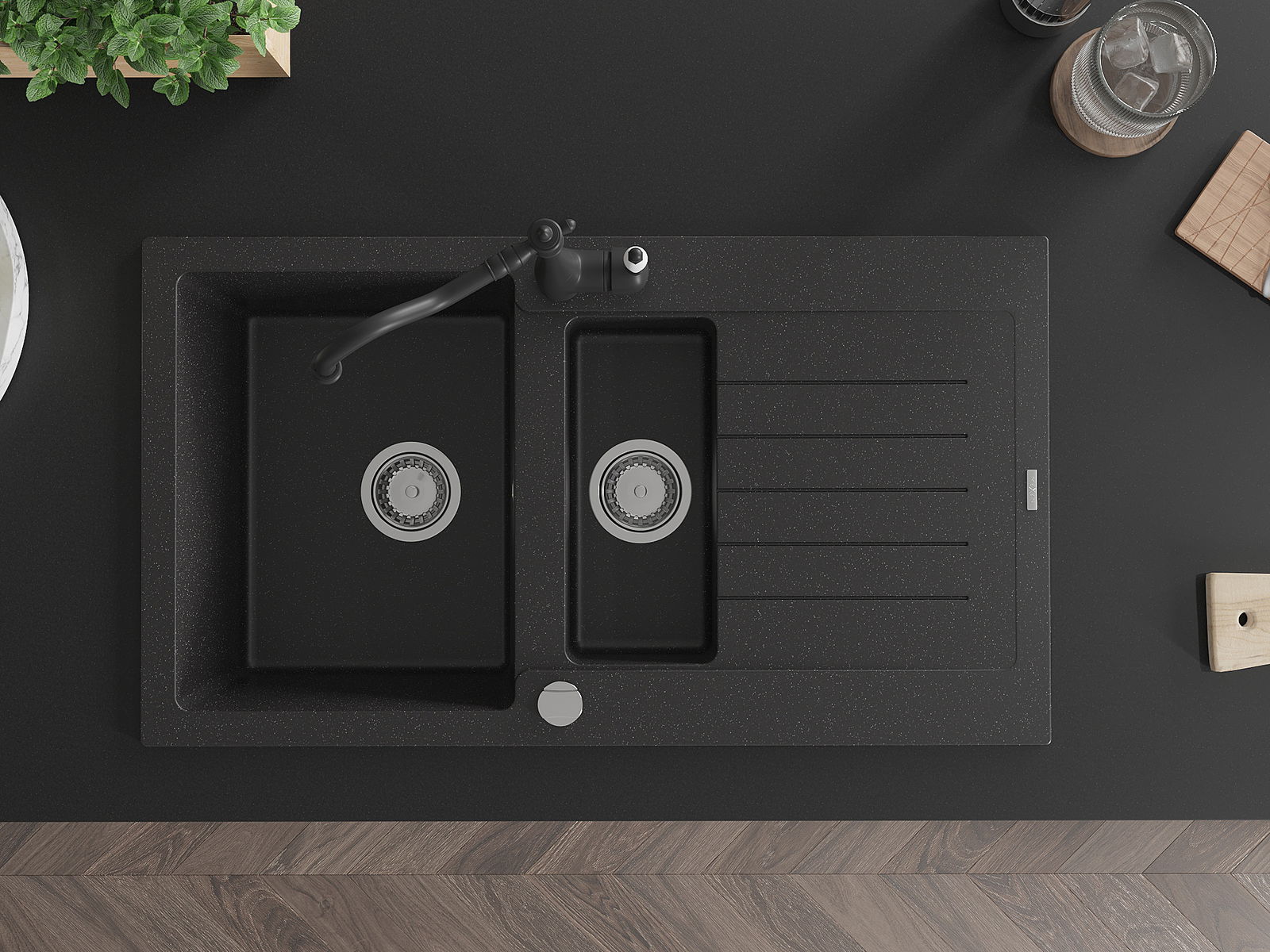 Mexen Matias žulový drez 1,5-kamorový s odkvapkávačom a kuchynskou batériou Carla čierny/strieborný metalik - 6502-73-670700-70