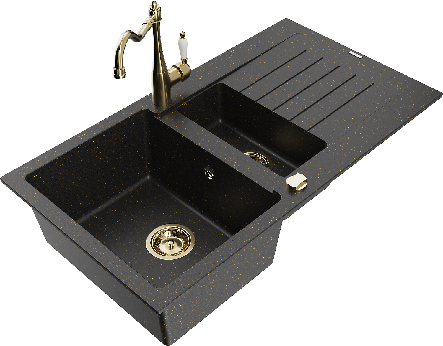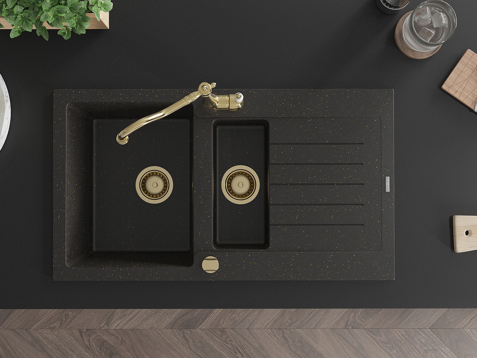 Mexen Matias granitový drez 1,5-komorový s odkvapkávačom a kuchynskou batériou Carla, čierna/zlatý metalik - 6502-75-670700-50