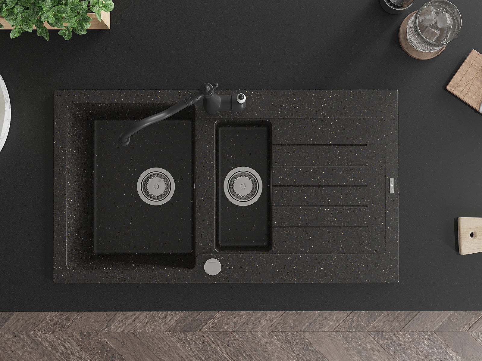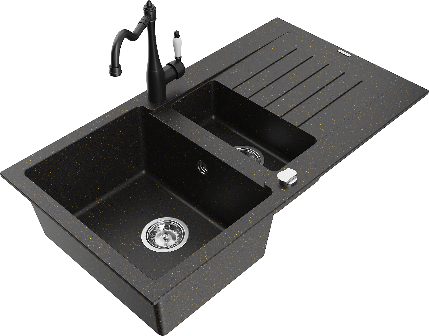 Mexen Matias žulový drez 1,5-komorový s odkvapkávačom a kuchynskou batériou Carla čierny/zlatý metalik - 6502-75-670700-70