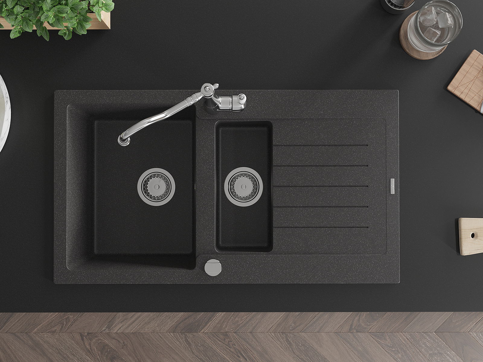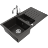 Mexen Matias granitový drez 1,5-komorový s odkvapkávačom a kuchynskou batériou Carla, čierny škvrnitý