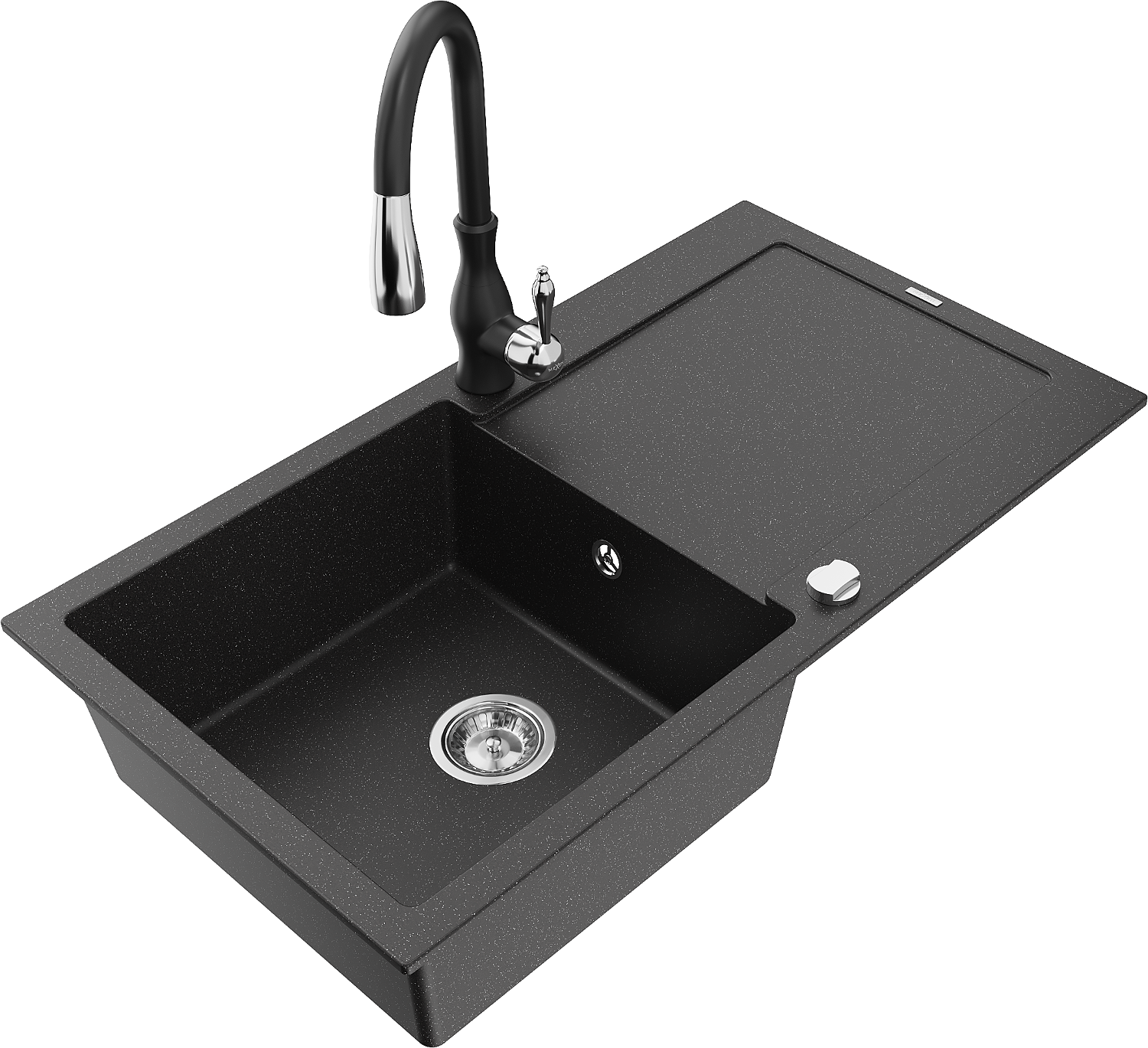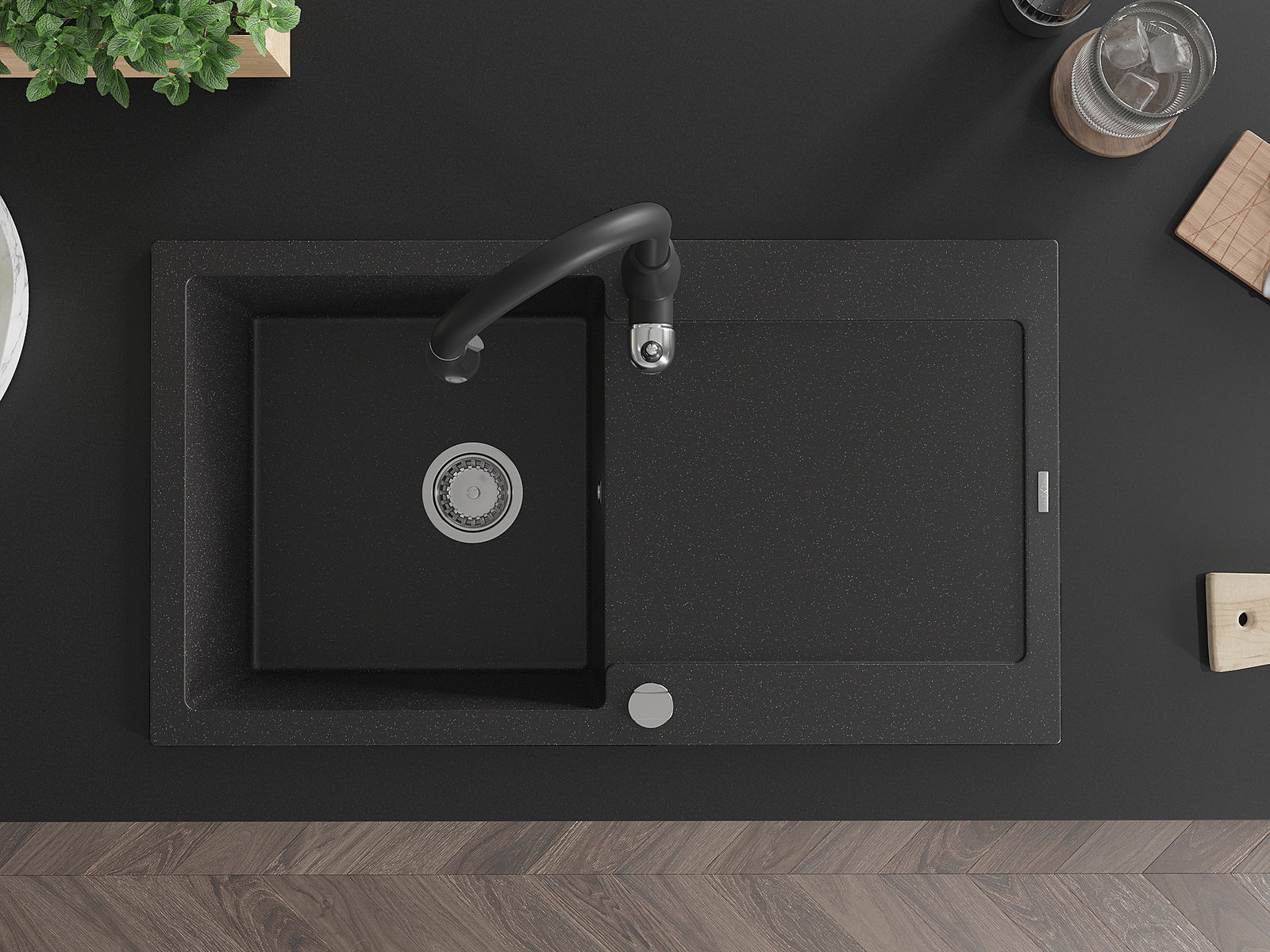 Mexen Leo granitový drez s 1 komorou s odkvapkávačom a kuchynskou batériou Savita, čierny/strieborný metalik