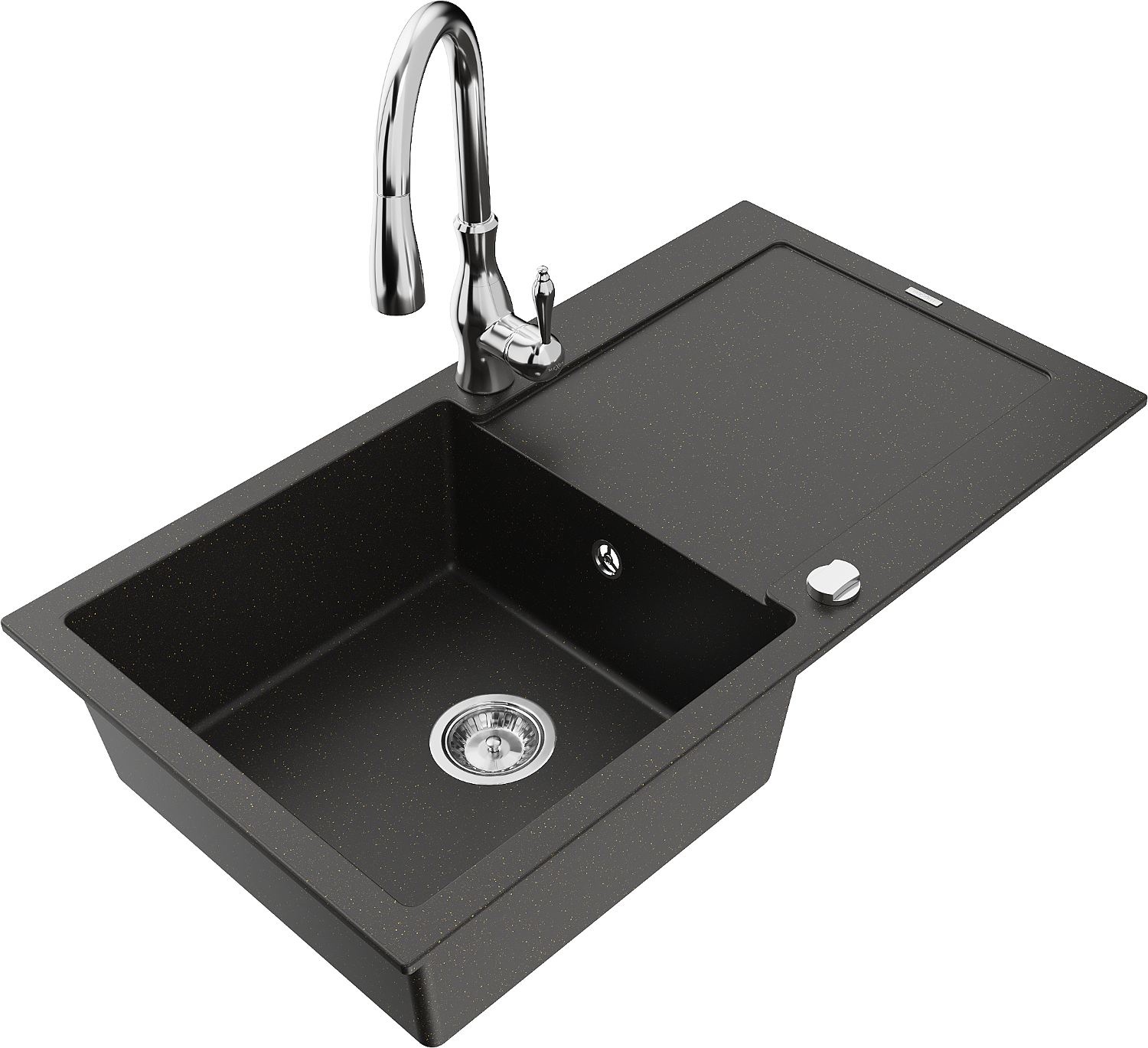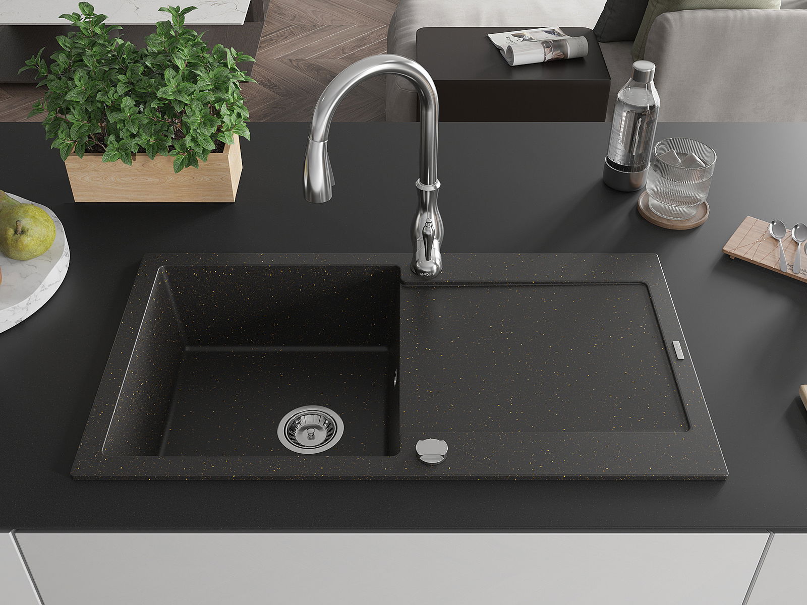 Mexen Leo granitový kuchynský drez s 1 komorou s odkvapkávačom a kuchynskou batériou Savita, čierna/zlatá metalická
