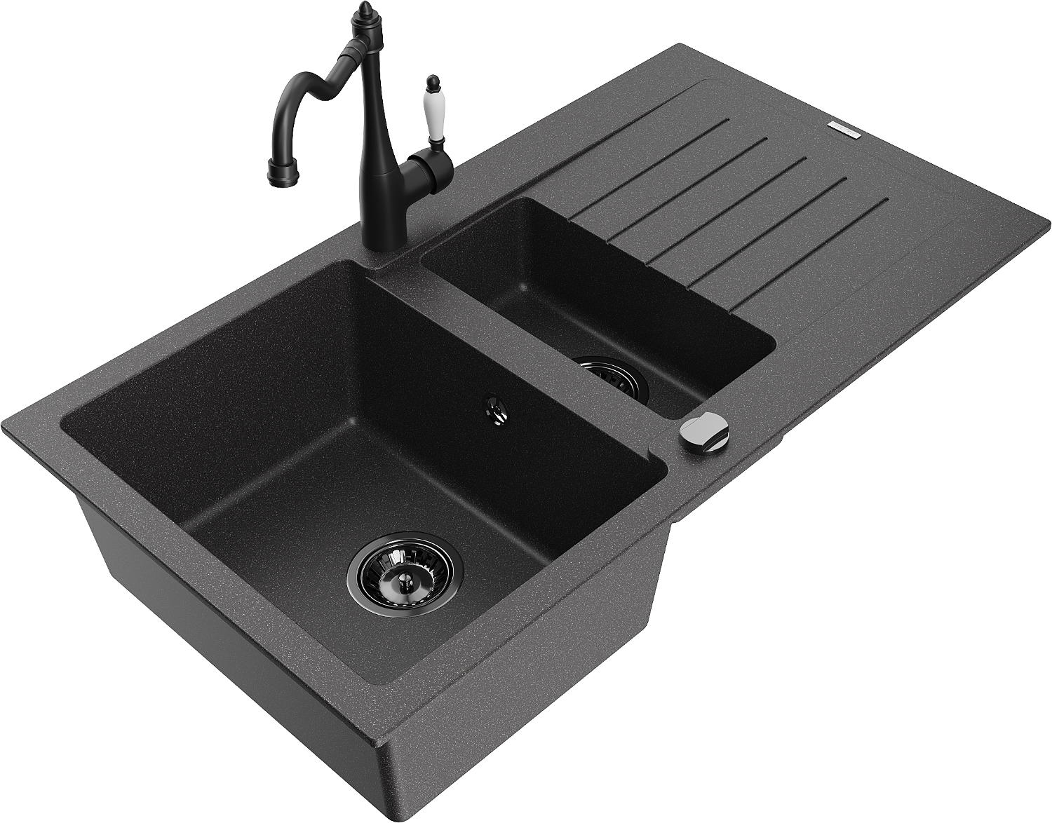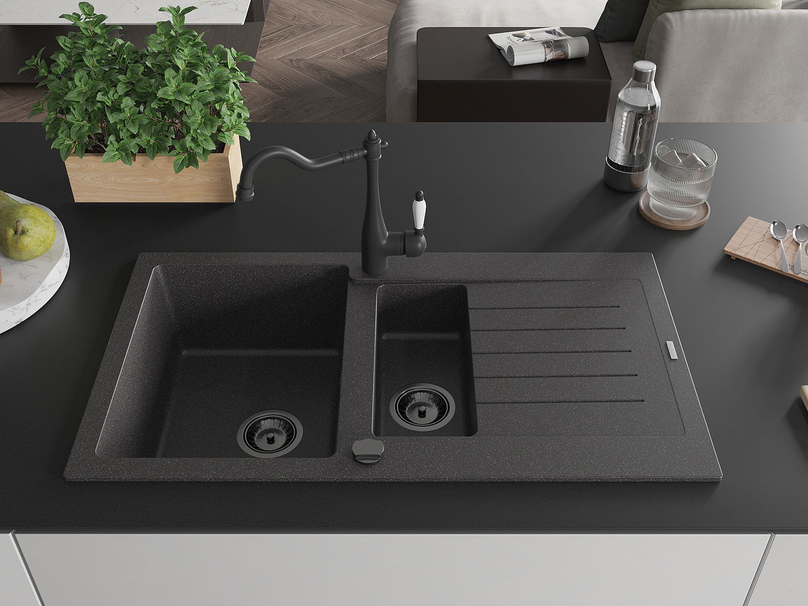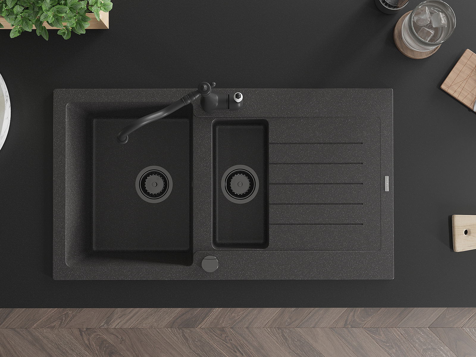 Mexen Matias granitový drez 1,5-komorový s odkvapkávačom a kuchynskou batériou Carla, čierny s bodkami
